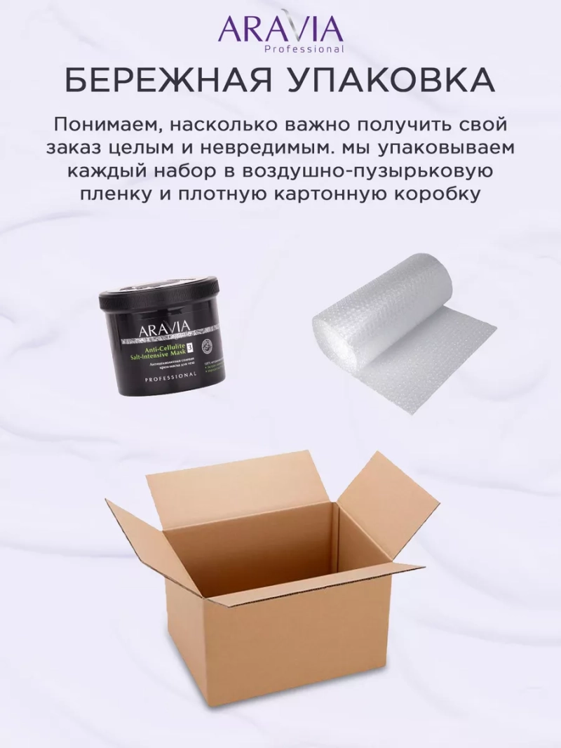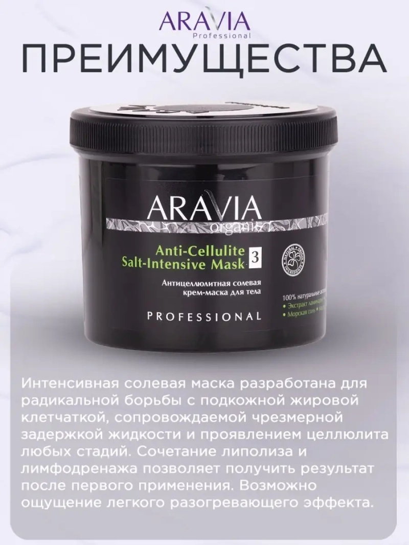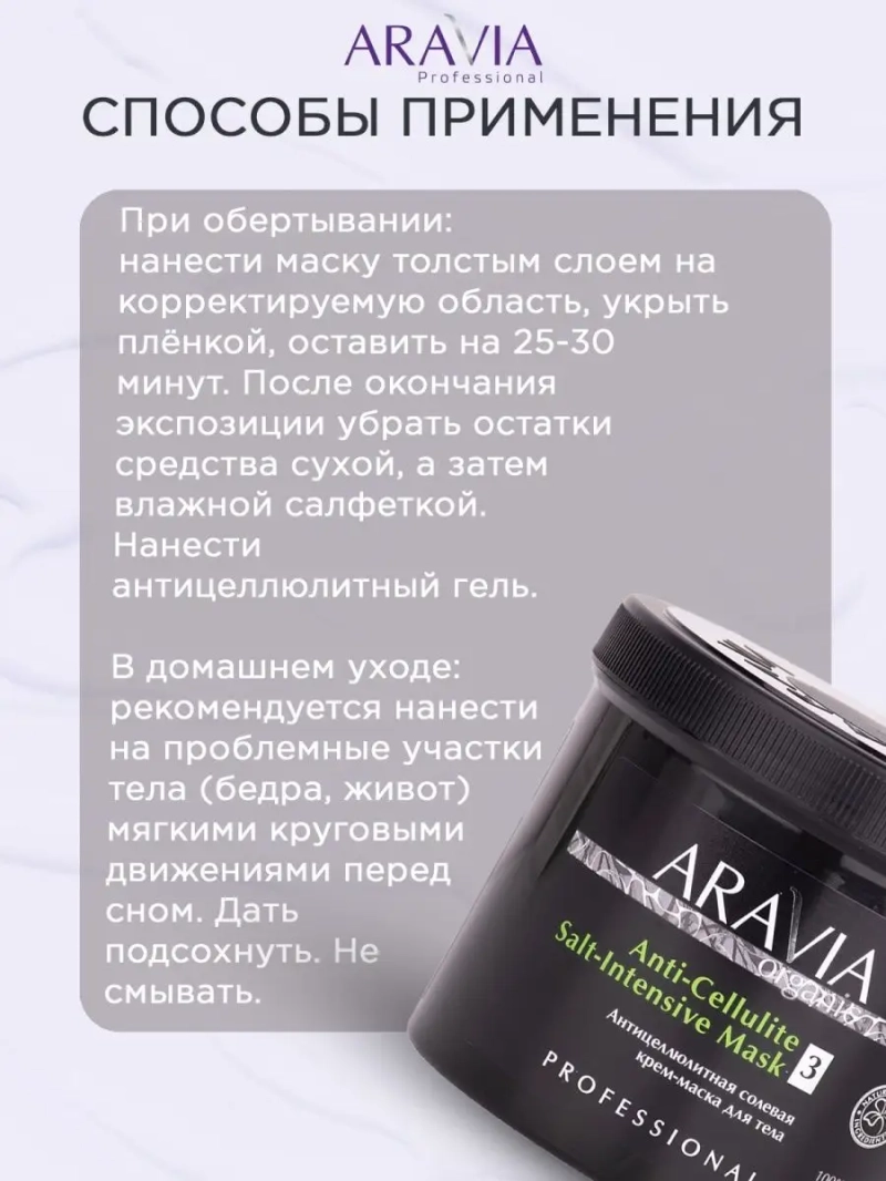 АНТИЦЕЛЛЮЛИТНАЯ СОЛЕВАЯ КРЕМ-МАСКА ДЛЯ ТЕЛА ANTI-CELLULITE SALT-INTENSIVE MASK, 550 МЛ. Интенсивная солевая маска разработана для радикальной борьбы с подкожной жировой клетчаткой, сопровождаемой чрезмерной задержкой жидкости и проявлением целлюлита любых стадий. Сочетание липолиза и лимфодренажа позволяет получить результат после первого применения. Возможно ощущение легкого разогревающего эффекта. Назначение: процедура обертывания в рамках антицеллюлитных программ. Рекомендации для использования: целлюлит 1-3 стадии; локальные жировые отложения; отечность. ДЕЙСТВИЕ: антицеллюлитное, жиросжигающее, укрепляющее, лимфодренажное. Биоактивный состав: морская соль, экстракт ламинарии, экстракт арники, масло ши. Морская соль — создает мощный осмотический эффект, способствует интенсивному расщеплению жировых клеток и выведению лишней жидкости, нормализует обменные процессы. Экстракт ламинарии — источник минералов и йода, повышает уровень обмена веществ, улучшает действие лимфотической системы, оказывает мощный антицеллюлитный эффект. Экстракт арники — способствует снятию отечности, тонизирует и стимулирует детоксикацию, повышает местный иммунитет кожи. Масло ши — восстанавливает тонус и эластичность тканей, удерживает влагу в эпидермисе, способствует снятию отеков, предотвращает появление стрий. СПОСОБ ПРИМЕНЕНИЯ: При обертывании: нанести маску толстым слоем на корректируемую область, укрыть плёнкой, оставить на 25-30 минут. После окончания экспозиции убрать остатки средства сухой, а затем влажной салфеткой. Нанести антицеллюлитный гель. В домашнем уходе: рекомендуется нанести на проблемные участки тела (бедра, живот) мягкими круговыми движениями перед сном. Дать подсохнуть. Не смывать. Примечание: перед первым применением протестируйте средство на небольшом участке кожи, чтобы исключить индивидуальную непереносимость компонентов.