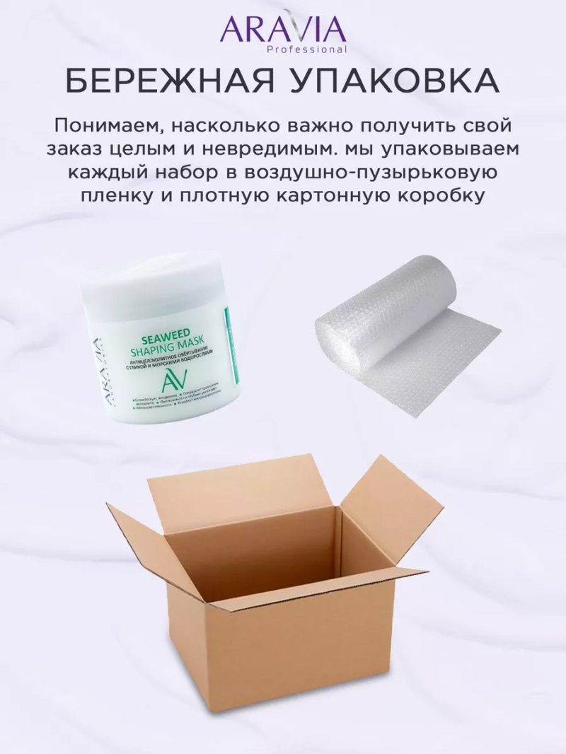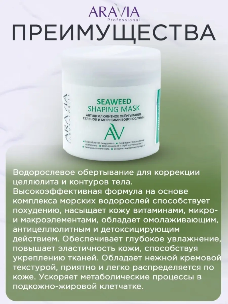 АНТИЦЕЛЛЮЛИТНОЕ ОБЁРТЫВАНИЕ С ГЛИНОЙ И МОРСКИМИ ВОДОРОСЛЯМИ SEAWEED SHAPING MASK, 300 МЛ. Водорослевое обертывание для коррекции целлюлита и контуров тела. Высокоэффективная формула на основе комплекса морских водорослей способствует похудению, насыщает кожу витаминами, микро- и макроэлементами, обладает омолаживающим, антицеллюлитным и детоксицирующим действием. Обеспечивает увлажнение, повышает эластичность кожи, способствуя укреплению тканей. Обладает нежной кремовой текстурой, приятно и легко распределяется по коже. Ускоряет метаболические процессы в подкожно-жировой клетчатке. Обертывание улучшает микроциркуляцию и способствует лимфотоку, снимает отечность. Удобная для использования кремовая текстура позволяет насладиться салонной SPA-процедурой в домашних условиях. Назначение: при атоничной коже, целлюлите и во время похудения. Рекомендации для использования: 1-2 раза в неделю курсом из 10-15 процедур. ДЕЙСТВИЕ: омолаживающее, увлажняющее, способствует похудению, сокращает проявления целлюлита, уменьшает отечность, ускоряет микроциркуляцию. Биоактивный состав: каолин, масло сладкого миндаля, экстракт ламинарии, экстракт фукуса, масло какао, экстракт спирулины, масло ши, витамин Е. Экстракт ламинарии — увлажняет, подтягивает кожу, повышает упругость, тонизирует кожу, ускоряет обмен веществ. Экстракт фукуса — обладает жиросжигающим и антицеллюлитным эффектом, способствует расширению сосудов. Смягчает, успокаивает и разглаживает кожу, делает ее эластичной и поддерживает тургор в хорошем состоянии. Масло какао — эффективно борется с первыми проявлениями старения, питает и увлажняет кожу, улучшает внешний вид кожи. СПОСОБ ПРИМЕНЕНИЯ: Нанесите средство плотным слоем на проблемные зоны тела. Накройте пленкой и оставьте на 30-40 минут. Остатки средства смойте водой. Примечание: перед первым применением протестируйте средство на небольшом участке кожи, чтобы исключить индивидуальную непереносимость компонентов.