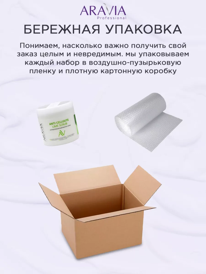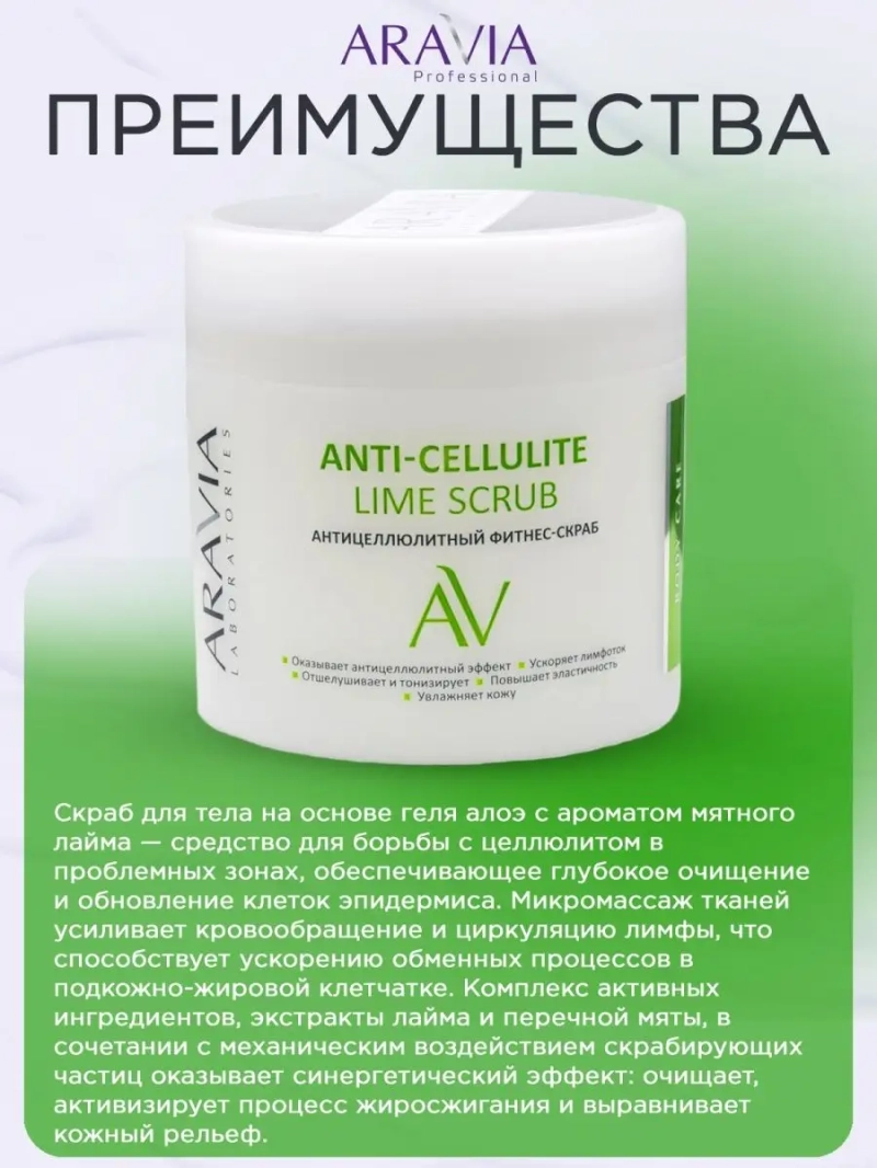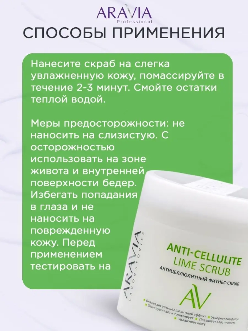 АНТИЦЕЛЛЮЛИТНЫЙ ФИТНЕС-СКРАБ ANTI-CELLULITE LIME SCRUB, 300 МЛ. Скраб для тела на основе геля алоэ с ароматом мятного лайма — средство для борьбы с целлюлитом в проблемных зонах, обеспечивающее глубокое очищение и обновление клеток эпидермиса. Микромассаж тканей усиливает кровообращение и циркуляцию лимфы, что способствует ускорению обменных процессов в подкожно-жировой клетчатке. Скраб тонизирует кожу и подготавливает ее к дальнейшему уходу: улучшает проникновение активных ингредиентов антицеллюлитных средств. Назначение: глубокое очищение, коррекция несовершенств — целлюлита, атоничной кожи и шелушений. Рекомендации для использования: рекомендуется использовать 1-2 раза в неделю. ДЕЙСТВИЕ: очищающее, смягчающее, осветляющее, стимулирует регенерацию клеток, насыщает кожу микроэлементами, устраняет сухость и шелушение. Экстракт лайма, экстракт перечной мяты, гель алоэ-вера. Экстракт лайма особенно ценится за свойство расщеплять жиры, способствовать похудению и устранению целлюлита. Омолаживает кожу за счет насыщения антиоксидантными витаминами и стимуляции внутрикожных процессов обмена. Витамин С способствует выработке коллагена, а тем самым улучшает кожный покров, помогает коже сохранять эластичность, здоровую упругость и прочность. Оказывает выраженное антицеллюлитное действие. Экстракт перечной мяты освежает и охлаждает кожу, обладает успокаивающим действием, снимает усталость кожи, усиливает кровообращение и укрепляет сосуды. Гель алоэ-вера обладает увлажняющими и влагоудерживающими свойствами, оказывает антиоксидантное воздействие, способствует насыщению кожи кислородом, улучшает регенерацию кожи, способствует повышению синтеза коллагена и эластина. СПОСОБ ПРИМЕНЕНИЯ: Нанесите скраб на слегка увлажненную кожу, помассируйте в течение 2-3 минут. Смойте остатки теплой водой. Меры предосторожности: не наносить на слизистую. С осторожностью использовать на зоне живота и внутренней поверхности бедер. Избегать попадания в глаза и не наносить на поврежденную кожу.
