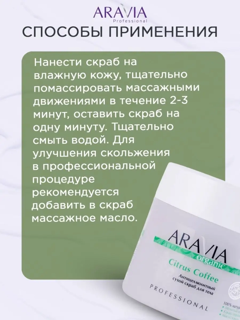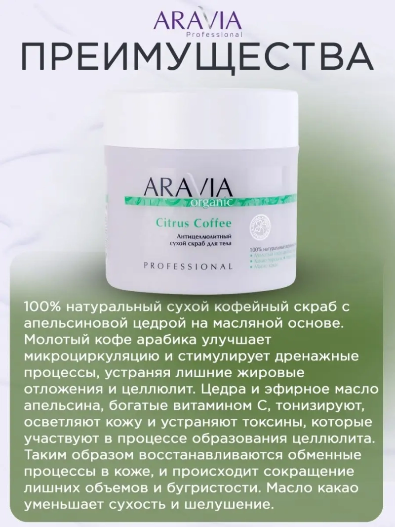 АНТИЦЕЛЛЮЛИТНЫЙ СУХОЙ СКРАБ ДЛЯ ТЕЛА CITRUS COFFEE, 300 МЛ. 100% натуральный сухой кофейный скраб с апельсиновой цедрой на масляной основе. Молотый кофе арабика улучшает микроциркуляцию и стимулирует дренажные процессы, устраняя лишние жировые отложения и целлюлит. Цедра и эфирное масло апельсина, богатые витамином С, тонизируют, осветляют кожу и устраняют токсины, которые участвуют в процессе образования целлюлита. Таким образом восстанавливаются обменные процессы в коже, и происходит сокращение лишних объемов и бугристости. Масло какао уменьшает сухость и шелушение, стимулирует процессы регенерации, оказывает профилактику образования растяжек. Скраб делает кожу более упругой и эластичной, помогая добиться идеально стройной фигуры. Назначение: программы похудения, антицеллюлитные процедуры, подготовка к обёртыванию, лифтинг и тонус кожи. Рекомендации для использования: Профессиональный уход: этап подготовки и очищения салонной процедуры. Домашний уход: 1-2 раза в неделю. Биоактивный состав: морская соль, сахар, молотый кофе арабика, масло сои, масло какао, масло ши, масло апельсина, цитрусовая пудра, масло сладкого миндаля, масло какао, витамин Е, сквалан. СПОСОБ ПРИМЕНЕНИЯ: Нанести скраб на влажную кожу, тщательно помассировать массажными движениями в течение 2-3 минут, оставить скраб на одну минуту. Тщательно смыть водой. Для улучшения скольжения в профессиональной процедуре рекомендуется добавить в скраб массажное масло. Меры предосторожности: не наносить на слизистую. С осторожностью использовать на зоне живота и внутренней поверхности бедер. Избегать попадания в глаза и не наносить на поврежденную кожу. Перед применением тестировать на небольшом участке кожи.
