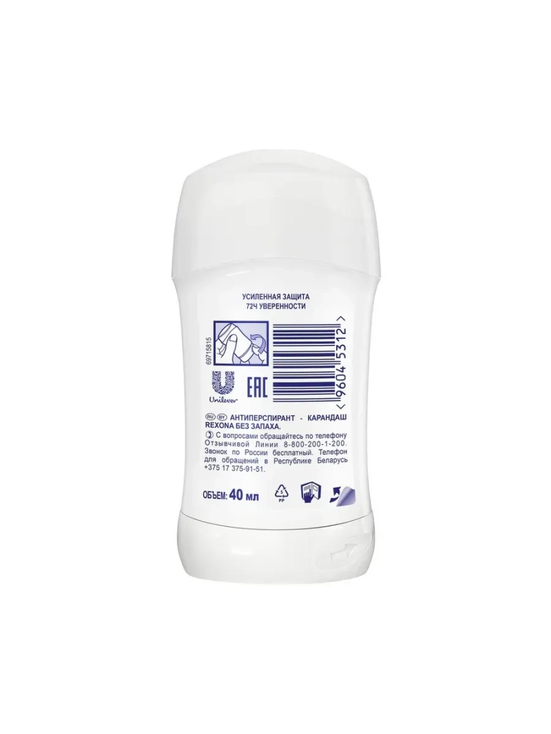 Дезодорант - антиперспирант карандаш Rexona Без запаха – универсальный антиперспирант, который подходит как для мужчин, так и для женщин. Rexona Без запаха имеет гипоаллергенную* формулу, которая не содержит отдушки, спирта**, красителей и парабенов. Несмотря на отсутствие аромата, он защищает вас на 48 часов от пота и запаха. Не перебивает аромат вашего парфюма. Подходит людям с чувствительной кожей и склонных к аллергии, раздражениям кожи, экземе, остро реагирующих на запахи. Также подходит беременным женщинам и кормящем мамам***. Двигайся с комфортом и наслаждайся каждым днем. Прогулочный шаг, неспешная пробежка, спринтерский бег ? тебе все по плечу, ведь мы позаботились о твоей защите. Чем бы вы ни занимались, вы будете чувствовать только комфорт. Покоряете ли вы новую вершину, спешите ли на автобус, выступаете ли с докладом или идете на свидание, будьте уверены, вы надежно защищены от пота и запаха - что бы вы ни запланировали, у Rexona есть решение! Наши продукты работают так же эффективно, как и вы. Мы стремимся узнать о поте как можно больше, чтобы затем использовать полученные знания для создания инновационных формул наших продуктов. Будьте уверены, Rexona никогда не подведет! *не содержит потенциальных аллергенов отдушки, дерматологически протестирован, **не содержит этилового спирта ,***Беременным и кормящим женщинам перед использованием рекомендуется проконсультироваться с врачом. Без запаха – непарфюмированный.