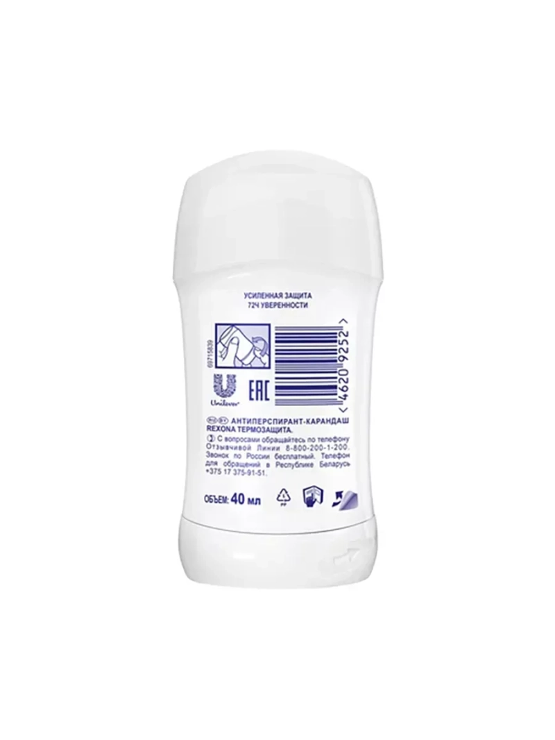Серия антиперспирантов Rexona Термозащита разработана специально для России с учетом климатических особенностей региона. В холодное время года, когда в верхней одежде мы заходим из холода улицы в жару отапливаемого помещения, наше тело перегревается - потоотделение усиливается и возникает запах пота. дезодорант - антиперспирант - карандаш Rexona Термозащита работает эффективно в любое время года при перепадах температур* и защищает вас в течение дня благодаря содержанию активных защитных микрокапсул Motionsense, обеспечивающих надежную защиту от запаха. Аромат Rexona Термозащита – это хрустящая свежесть яблока и зеленого листа. Цветочное сердце раскрывается нотами ландыша, теплого жасмина, розы и иланг-иланга. Пудровые, древесные и мускатные ноты добавляют базе аромата теплоты и сладости.дезодорант - антиперспирант можно использовать в любое время года. Особенно эффективным он будет зимой, когда организм испытывает постоянные перепады температур из-за теплой верхней одежды. Чем больше вы двигаетесь, чем больше выделяется пота, тем интенсивнее работает антиперспирант.Покоряете ли вы новую вершину, спешите ли на автобус, выступаете ли с докладом или идете на свидание, будьте уверены, вы надежно защищены от пота и запаха - что бы вы ни запланировали, у Rexona есть решение! Наши продукты работают так же эффективно, как и вы. Мы стремимся узнать о поте как можно больше, чтобы затем использовать полученные знания для создания инновационных формул наших продуктов. Rexona никогда не подведет! *эффективная защита антиперспиранта 48 ч при повышении температуры окружающей среды/тела