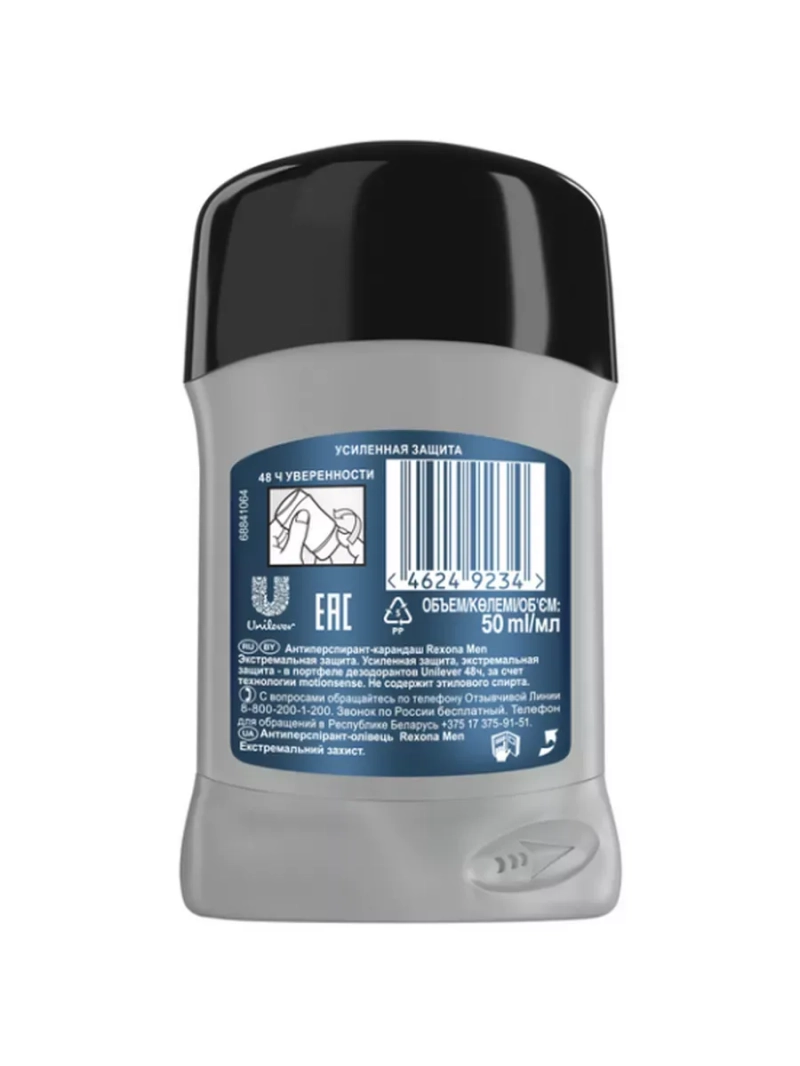 Полное наименование: Антиперспирант - карандаш Рексона / REXONA MEN Экстремальная защита 50мл. Производитель: Unilever Россия. Почувствуйте надежную защиту от пота и запаха до 72 часов* с антиперспирантом Экстремальная защита от Rexona Men. Новая** революционная технология Motionsense активируется при движении, сохраняя свежесть и абсолютный** комфорт до 72 часов. Микрочастицы создают дышащую микропленку для надежной защиты от пота и запаха. Потовые железы блокируются частично, кожа при этом «дышит». *хот рум тест, Unilever R&D, 2019. **в портфеле Unilever, за исключением линейки Rexona Clinical Protection.