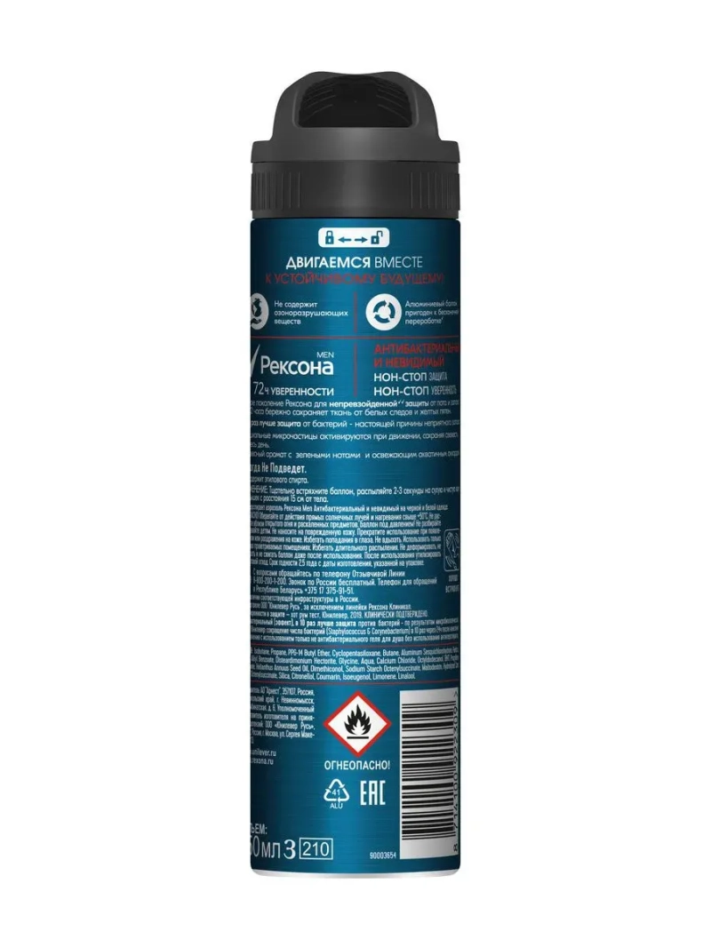 Антиперспирант спрей Rexona Men Антибактериальный и невидимый на черной и белой одежде с технологией двойной защиты: нет поту, нет запаху, нет белым следам на черном и желтым пятнам на белом. В его формуле достигнут оптимальный баланс: концентрация активного компонента делает формулу невидимой на коже и одежде без ущерба эффективности против бактерий, которые являются причиной неприятного запаха. Он обеспечивает в 10 раз более эффективную защиту против бактерий, вызывающих неприятный запах, а также бережно относится к нежной коже подмышек.