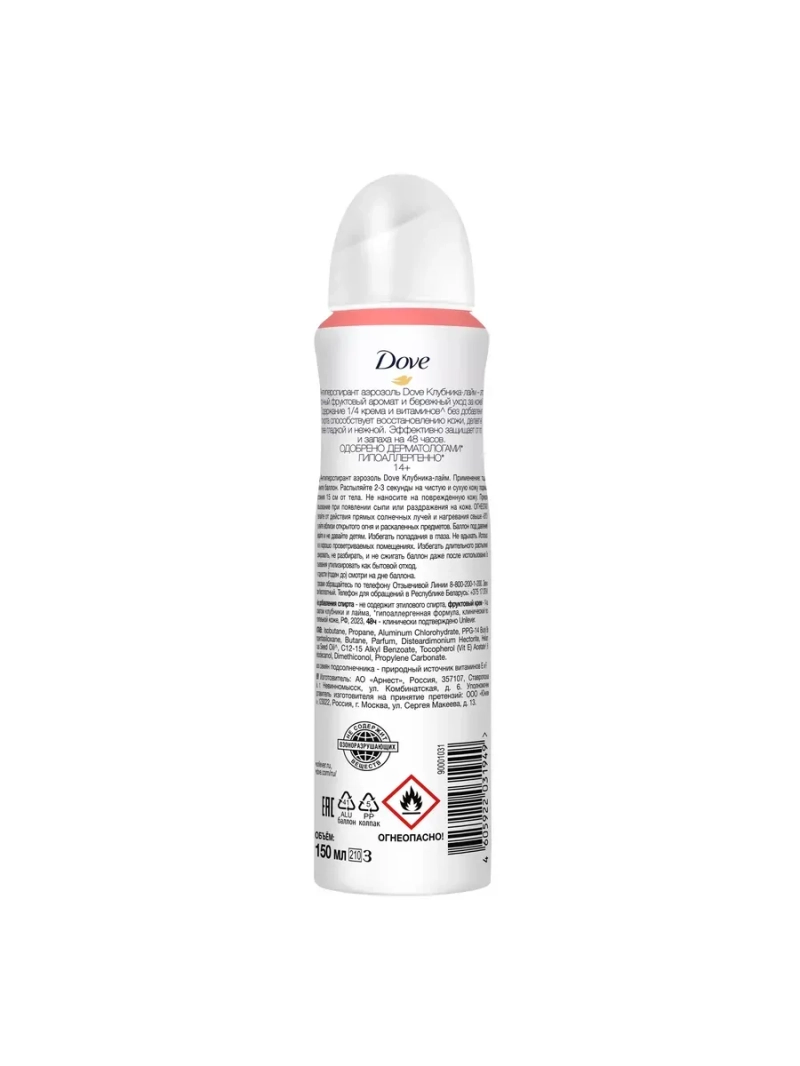 Для надежной защиты от пота и запаха попробуйте антиперспирант-аэрозоль Клубника-лайм от Dove. Он эффективно защищает от пота и запаха на 48 часов. В составе 1/4 фруктового крема и витамины^. Женский антиперспирант ухаживает за кожей и способствует восстановлению, делает её более гладкой и нежной. Гипоаллергенно*. 48ч - клинически подтверждено Юнилевер. * гипоаллергенная формула, клинический тест на чувствительной коже, РФ, 2023. ^ масло семян подсолнечника - природный источник витаминов E и F.