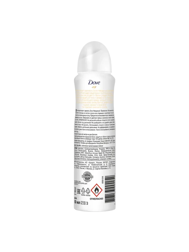 Бренд Dove считает, что красота – это источник уверенности в себе, а не беспокойства. В основе каждого продукта лежат безопасные ингредиенты, средства не проходят тестирование на животных. Мы придаем большое значение женской уверенности в себе, потому создали стойкий антиперспирант , позволяющий жить насыщенно, не чувствуя стеснения из-за пота и его последствий. Антиперспирант-аэрозоль DOVE Невидимый разработан для представительниц прекрасного пола и подростков, только начинающих формировать положительное восприятие своей внешности. Пользуясь нашими продуктами, вы не почувствуете ничего, кроме абсолютной уверенности и комфорта. Dove антиперспирант-аэрозоль Невидимый, 150 мл на четверть состоит из увлажняющего крема и обеспечивает эффективную защиту от пота и запаха на 48 ч. Невидимый спрей легко наносится и не оставляет белых следов на темных и ярких тканях . Антиперспирант для женщин знает, как ухаживать за нежной кожей подмышек. За три дня продукт восстанавливает кожу, устраняя дискомфорт и видимые признаки раздражения после бритья. Антиперспирант женский не содержит этиловый спирт. В составе есть масло семян подсолнечника. Это природный источник витаминов E и F. Верные союзники красоты и молодости активно борются с воздействием свободных радикалов и помогают коже восстановиться еще быстрее. Антиперспирант выпускается в удобном и стильном флаконе с защитным колпачком. Использовать его очень легко: хорошо встряхните, распылите средство на сухую и чистую кожу подмышек, держа баллон на расстоянии 15 см от поверхности. Подходит антиперспирант для женщин и девушек от 14 лет.