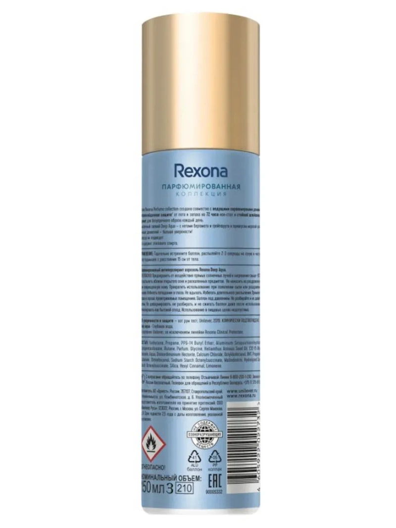 Парфюмированный дезодорант женский DEEP AQUA – это средство из новой парфюмированной коллекции Рексона Perfume, созданной совместно с ведущими парфюмерными домами. Антиперспирант женский спрей имеет свежий акватический аромат с нотами бергамота и грейпфрута. Дезодорант антиперспирант защищает от пота и запаха в течение 72 часов*. Дезодорант женский разработан на основе технологии со специальными микрочастицами, которые раскрываются во время движения, высвобождая аромат. DEEP AQUA - Глубокая вода. Perfume - парфюмированная коллекция. *72ч уверенности в защите - хот рум тест, Юнилевер, 2019. Клинически подтверждено.