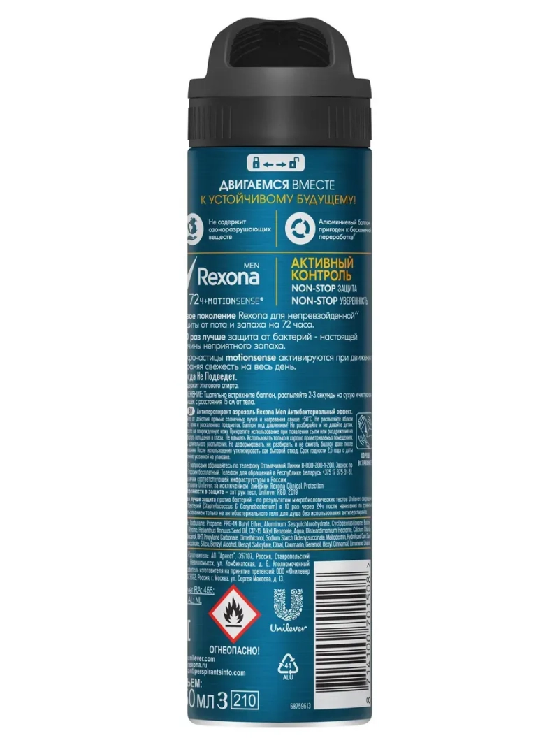 Полное наименование: Антиперспирант аэрозоль Рексона / REXONA Men Антибактериальный эффект 150мл. Производитель: Unilever Россия. Антиперспирант аэрозольный REXONA Men Антибактериальный эффект 150 мл с маслами цитрусовых и эвкалипта совместно с технологией Motionsense обеспечивает в 10 раз более эффективную защиту против бактерий, вызывающих неприятный запах, а также бережно относится к нежной коже подмышек. Микрокапсулы, нанесенные на кожу, раскрываются во время движения, высвобождая заряды потрясающей свежести. Защищает от пота и запаха на 48 часов.