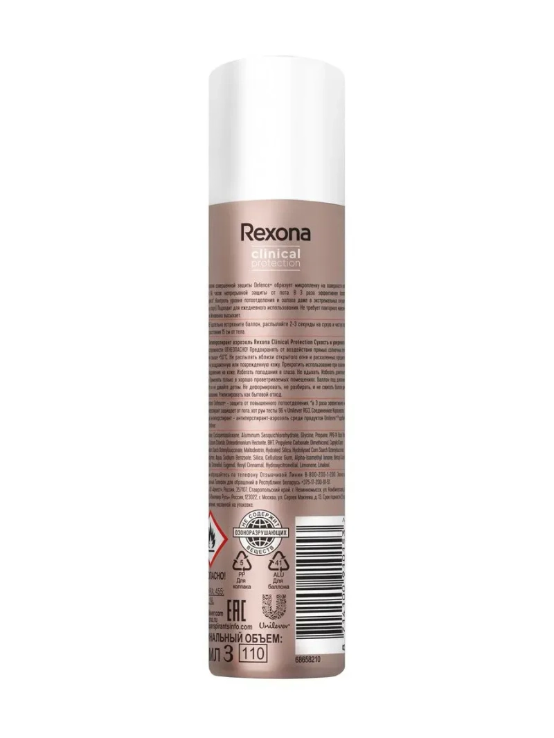 Для тех, кому нужна беспрецедентная защита от пота и неприятного запаха, чтобы быть уверенным в каждом дне и быть готовым ко всему, Rexona представляет новое поколение** антиперспирантов Rexona Clinical Protection. Все люди потеют. Некоторые из нас потеют больше, чем другие. Некоторые потеют более обильно в определенных ситуациях, которые могут быть непредвиденными, что вызывает дискомфорт и стеснение. Чтобы регулировать повышенное потоотделение и помогать вам оставаться сухим и свежим даже при стрессе, Rexona разработала революционную технологию совершенной защиты Defence+, которая образует микропленку на поверхности кожи, обеспечивая 96 часов непрерывной защиты от пота и запаха. Мы уменьшили и стабилизировали размер частиц активного вещества, и теперь защита стала в 3 раза эффективнее базового антиперспиранта. Чем меньше частица актива, тем лучше она проникает в пору и надежно удерживает пот внутри. Пот внутри - сухость снаружи.* Максимальная защита в экстремальных ситуациях (стресс, жара, спорт). Мгновенно высыхает, не требует повторного нанесения в течение дня и подходит для ежедневного использования. Необыкновенно сладкий и освежающий арома. Экзотические груша, ананас и мандарин элегантно оттеняют сердце композиции из нот жасмина и розы, которые величественно располагаются на ложе из успокаивающих древесных нот, ванили и амбры. Clinical protection/ Defence+ (клиникал протекшн/Дефенс+) - защита от повышенного потоотделения. *В 3 раза эффективнее, чем базовый антиперспирант аэрозоль среди продуктов Unilever защищает от пота, хот рум тесты 96 ч Unilever R&D, Соединенное Королевство, 2018. **Cреди продуктов Unilever. ВНИМАНИЕ! Страна производитель может отличаться в зависимости от места нахождения производства конкретного товара!