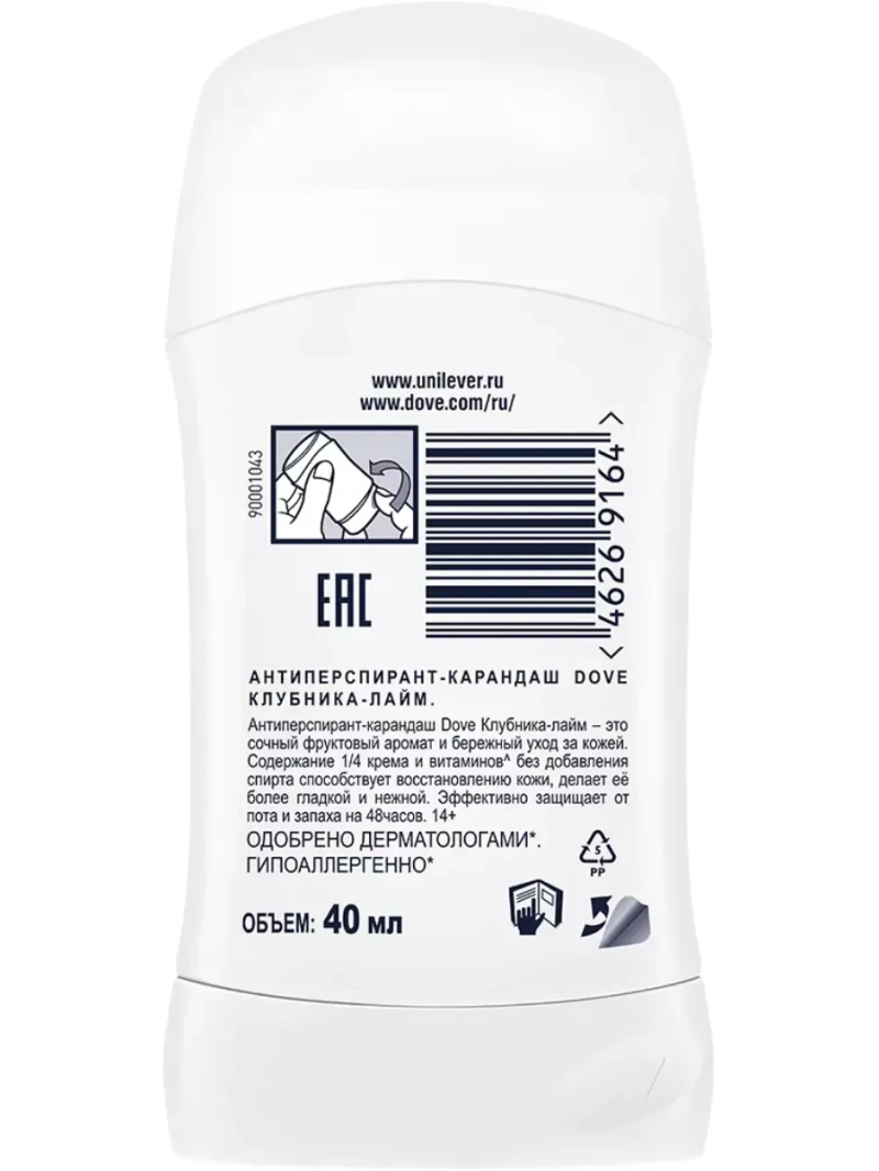 Для эффективной и бережной защиты от пота и запаха попробуйте антиперспирант-карандаш Dove Клубника-лайм. Он на ? обогащен фруктовым кремом. Надежно защищает от пота и запаха до 48 часов, восстанавливая и питая кожу. Гипоаллергенен*. Антиперспирант имеет тонкий аромат свежих ягод с освежающими акцентами мяты, дополненными цветочными аккордами. 48ч - клинически подтверждено Юнилевер. * гипоаллергенная формула, клинический тест на чувствительной коже, РФ, 2023.