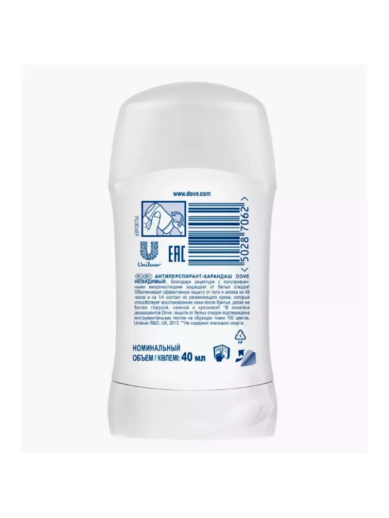 Dove антиперспирант -стик Невидимый, 40 мл создан с любовью к природе и женщинам. Философия бренда заключается в принятии естественной красоты, уверенности в себе и заботе о теле. В рекламе продукции не участвуют профессиональные модели: естественность без ретуши и цифровой обработки является основой для насыщенной и счастливой жизни. Антиперспирант женский и все средства линейки производятся без тестирования на животных. Стик Dove, состоящий на четверть из увлажняющего крема, обеспечивает надежную защиту от пота и запаха на 48 ч. Вы можете не беспокоиться о выборе гардероба и носить все, что захочется. Антиперспирант для женщин не оставляет белых следов на как на темных, так и на ярких тканях. Средство эффективно помогает коже восстановиться после бритья и депиляции всего за три дня, устраняя сухость и раздражения. Отсутствие в формуле этилового спирта сохраняет поверхность подмышек нежной и бархатистой. В составе есть Helianthus Annuus Seed Oil – масло семян подсолнечника. Содержание витамина E и F препятствует преждевременному старению кожи любого типа, поддерживая ее молодость и эластичность. Антиперспирант женский подходит также подросткам от 14 лет, формируя у девушек положительное отношение к своей внешности и создавая возможности для раскрытия потенциала без стеснения. Карандаш-стик выпускается в удобном и компактном контейнере. Контролировать процесс нанесения просто благодаря поворотному основанию. Средство с кремовой текстурой легко наносится и распределяется на поверхности кожи. Безопасный антиперспирант для женщин подходит для частого использования. Он эффективно нейтрализует неприятные запахи и дарит ощущение свежести на весь день.