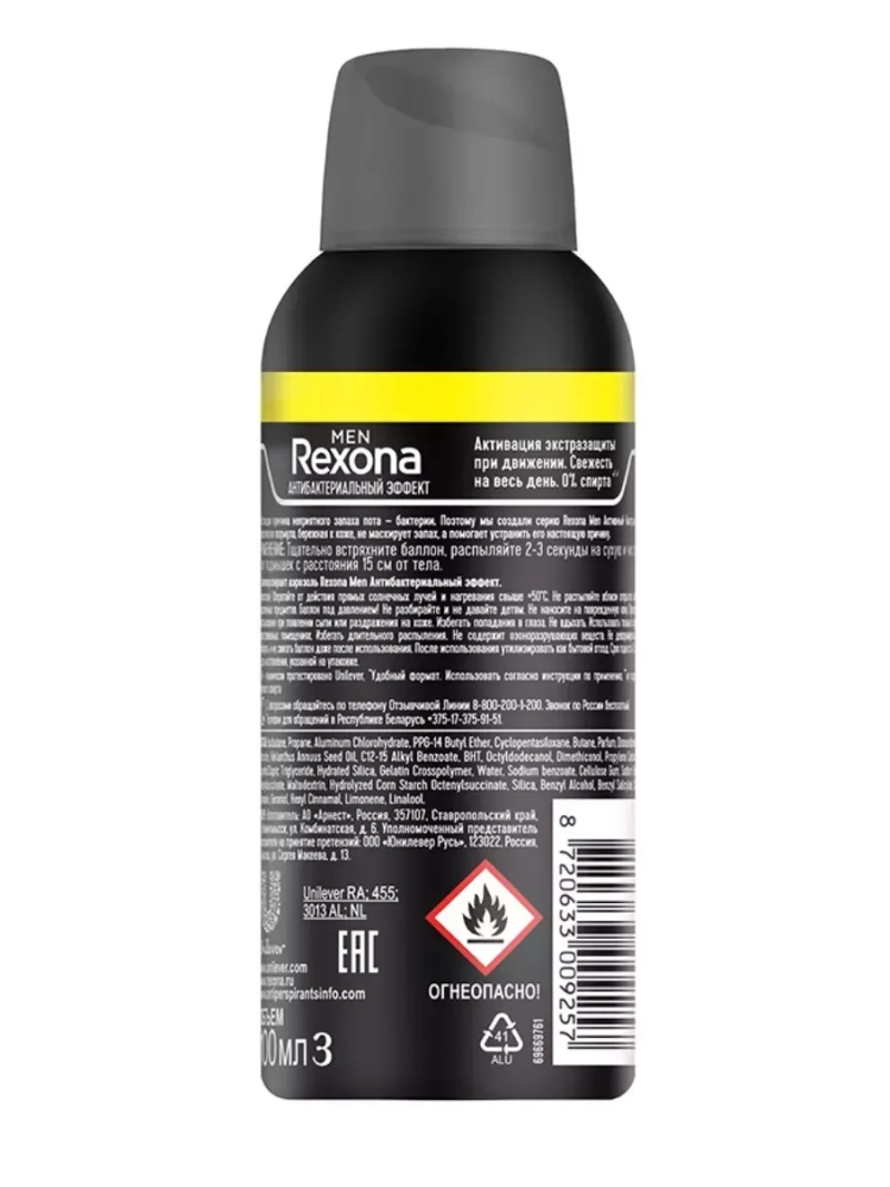 Полное наименование: Антиперспирант аэрозоль Рексона/REXONA Men Антибактериальный эффект 100мл. Производитель: Unilever Россия. Антиперспирант-аэрозоль Rexona Men Антибактериальный эффект надежно защитит вас от пота и запаха до 48 часов*. Настоящая причина неприятного запаха пота – бактерии. Эффективная формула Rexona Men Активный Контроль не маскирует запах, а помогает устранить его настоящую причину. Объем 100 мл как нельзя кстати, когда антиперспирант нужно взять с собой. Не содержит парабены и этиловый спирт.