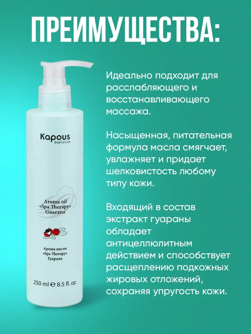 Арома масло Гуарана Spa Therapy - это уникальный продукт, который предназначен для удаления остатков сахара и воска после депиляции. Оно отлично подходит для расслабляющего и восстанавливающего массажа. Обладая насыщенной питательной формулой, это масло смягчает, увлажняет и придает шелковистость любому типу кожи.Одним из ключевых компонентов этого ароматического масла является экстракт гуараны. Он обладает антицеллюлитными свойствами и способствует расщеплению подкожных жировых отложений, сохраняя упругость кожи. Благодаря его наличию в составе, это масло также обладает противовоспалительным эффектом, быстро и эффективно снимая раздражение кожи при воспалительных реакциях после депиляции.Особенно привлекательным в этом масле является его насыщенный аромат экзотического фрукта гуараны. Он не только создает атмосферу спокойствия и расслабления во время массажа, но и помогает расслабиться после напряженного дня.Данный продукт подходит как для профессионального использования, так и для домашнего использования. Вы можете нанести небольшое количество арома масла на тело и легкими массажными движениями втереть его до полного впитывания. Ощутите, как ваша кожа становится более мягкой, увлажненной и шелковистой с каждым применением.Бренд известен своими инновационными продуктами для ухода за телом, и это арома масло Гуарана не исключение. Оно разработано с учетом всех потребностей кожи и обеспечивает наилучший результат. Вы можете быть уверены, что ваша кожа будет иметь здоровый и ухоженный вид с использованием этого масла.Закажите арома масло Гуарана Spa Therapy уже сегодня и наслаждайтесь великолепными результатами! Формула масла обеспечивает длительный эффект, поэтому оно подходит для частого применения. Откройте для себя все преимущества этого продукта и наслаждайтесь моментами истинного расслабления и ухода за собой.