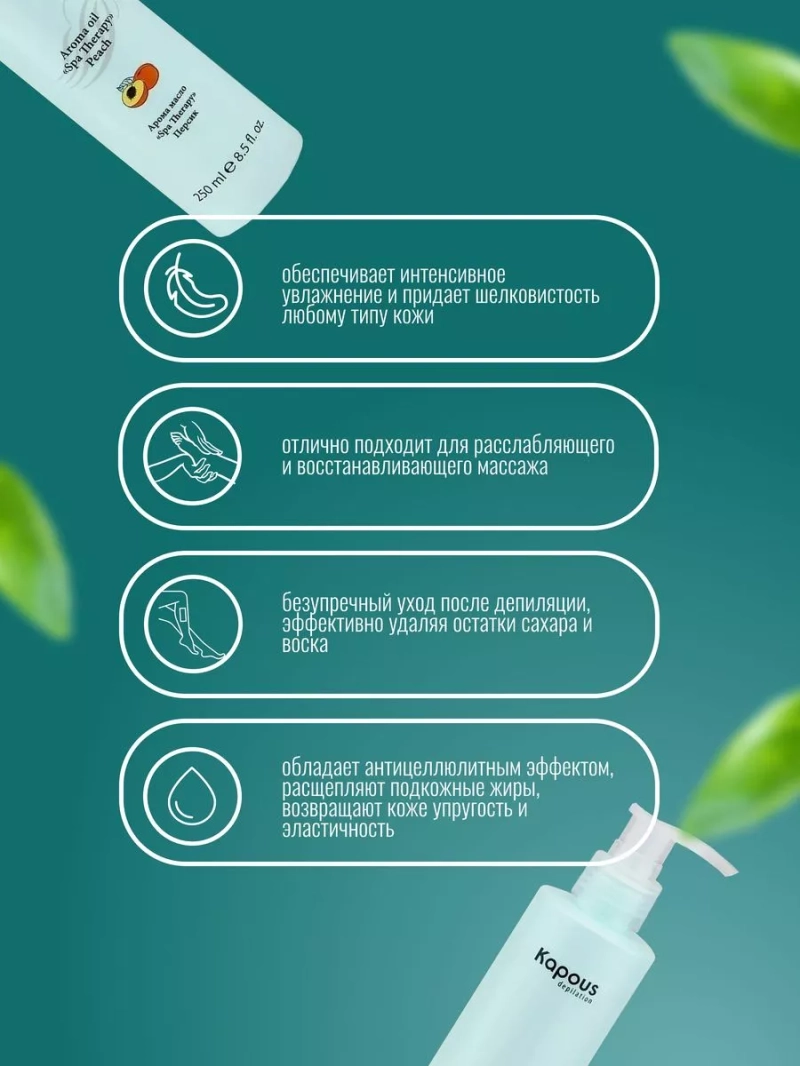 Арома масло Персик Spa Therapy - это идеальный спутник ваших релаксационных и восстанавливающих моментов. Разработанное с учетом самых высоких стандартов качества, это масло не только удаляет остатки сахара и воска после депиляции, но и обеспечивает нежное питание и увлажнение кожи. В составе арома масла вы найдете ценный экстракт календулы, которая эффективно успокаивает и снимает раздражение после депиляции. Календула также способствует регенерации клеток кожи, делая ее более гладкой и упругой. Уникальное сочетание персикового аромата и нежной текстуры масла создает незабываемую атмосферу роскоши и релаксации. Каждый раз, нанося это масло на ваше тело, вы окунетесь в мир приятных ощущений и заботы о себе. Благодаря своей легкой формуле, арома масло быстро впитывается и моментально дарит вашей коже шелковистость и неповторимое сияние. Вы почувствуете, как ваша кожа становится эластичной, увлажненной и утонченной на ощупь. Не только для домашнего использования, это арома масло также пригодно для профессионального применения. Добавьте его в свою коллекцию SPA-процедур или применяйте для массажа - оно подарит вам незабываемое ощущение релаксации и комфорта. Рекомендуется нанести небольшое количество арома масла на тело и втереть его в кожу легкими массажными движениями для полного впитывания. Вы можете использовать масло повседневно, оно не имеет противопоказаний к частому применению. Раскройте свою индивидуальность с арома маслом Персик Spa Therapy. Ощутите на себе незабываемый аромат персика, погрузитесь в мир приятных ощущений и заботы о себе. Почувствуйте, как ваша кожа оживает и становится сияющей благодаря этому невероятно эффективному и ободряющему продукту. Не упустите шанс превратить вашу домашнюю процедуру ухода за кожей в настоящий SPA-салон. Попробуйте арома масло Персик Spa Therapy уже сегодня и дарите себе настоящий уход и релаксацию каждый день.