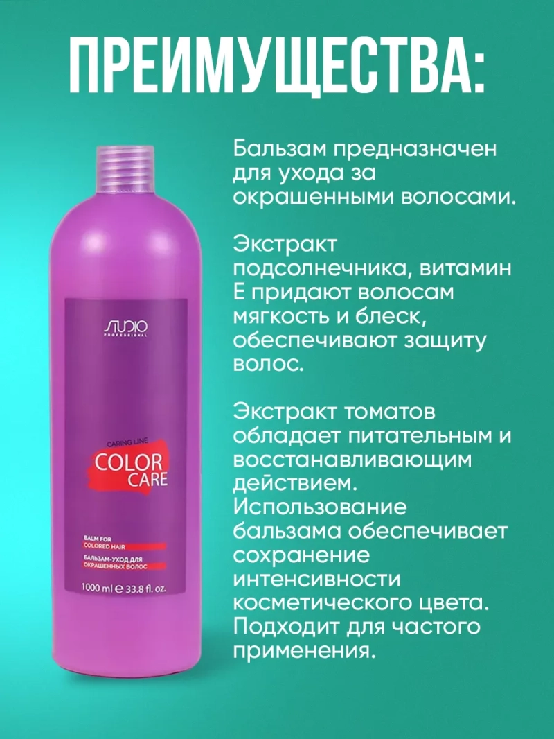 Бальзам для ухода за окрашенными и мелированными волосами эффективно восстанавливает повреждённую кутикулу волос, обеспечивает питательными и увлажняющими веществами, необходимыми для здорового блеска и эластичности волос. Входящие в его состав косметические масла обеспечивают им увлажнение, разглаживают поверхность волос, придавая шелковистый блеск, натуральный экстракт подсолнечника придаёт... Бальзам для ухода за окрашенными и мелированными волосами эффективно восстанавливает повреждённую кутикулу волос, обеспечивает питательными и увлажняющими веществами, необходимыми для здорового блеска и эластичности волос. Входящие в его состав косметические масла обеспечивают им увлажнение, разглаживают поверхность волос, придавая шелковистый блеск, натуральный экстракт подсолнечника придаёт волосам мягкость и сохраняет первоначальную яркость цвета, препятствуя вымыванию . Курс применения шампуня и бальзама-ухода Color саге способствует сохранению цвета ярким и насыщенным долгое время, обеспечивает защиту волос от воздействия внешних факторов окружающей среды.Способ применения: Нанести необходимое количество бальзама на чистые влажные волосы, равномерно распределяя, оставить на 3-5 минут, смыть теплой водой. Для оптимального ухода использовать с шампунем для окрашенных волос Color Care .