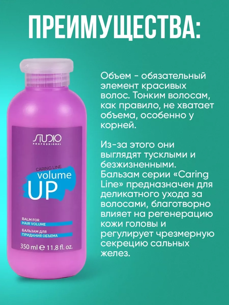 Бальзам для придания объема "Volume up" серии "Caring Line". Объем - обязательный элемент красивых волос. Тонким волосам, как правило, не хватает объема, особенно у корней. Из-за этого они выглядят тусклыми и безжизненными. Бальзам серии "Caring Line" предназначен для деликатного ухода за волосами, благотворно влияет на регенерацию кожи головы и регулирует чрезмерную секрецию сальных желез. Специально разработанная формула с витаминами группы В придает объем даже слабым волосам. Комплексное воздействие фруктовых кислот и пантенола улучшают прочность и эластичность волос по всей длине, предотвращая образование секущихся кончиков. Бальзам не утяжеляет волосы, делает их мягкими и послушными, облегчает расчёсывание. Предотвращает повреждение волос от высоких температур во время использования фена и снимает статическое электричество. Способ применения: нанести необходимое количество бальзама на чистые влажные волосы, равномерно распределяя, оставить на 3-5 минут, смыть теплой водой. Для оптимального ухода использовать с шампунем для придания объема "Volume Up".