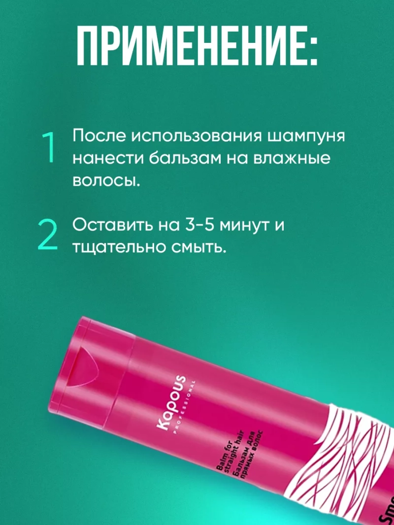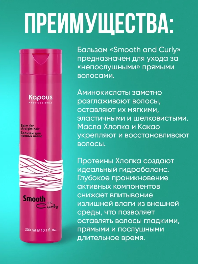 Бальзам Smooth and Curly предназначен для ухода за "непослушными" прямыми волосами. Аминокислоты заметно разглаживают волосы, оставляют их мягкими, эластичными и шелковистыми. Масла Хлопка и Какао укрепляют и восстанавливают волосы. Протеины Хлопка создают идеальный гидробаланс. Глубокое проникновение активных компонентов снижает впитывание излишней влаги из внешней среды, что позволяет оставлять волосы гладкими, прямыми и послушными длительное время. СПОСОБ ПРИМНЕНИЯ: после использования шампуня для прямых волос равномерно нанести бальзам на влажные волосы. Оставить на 3-5 минут, смыть. Подходит для частого использования.