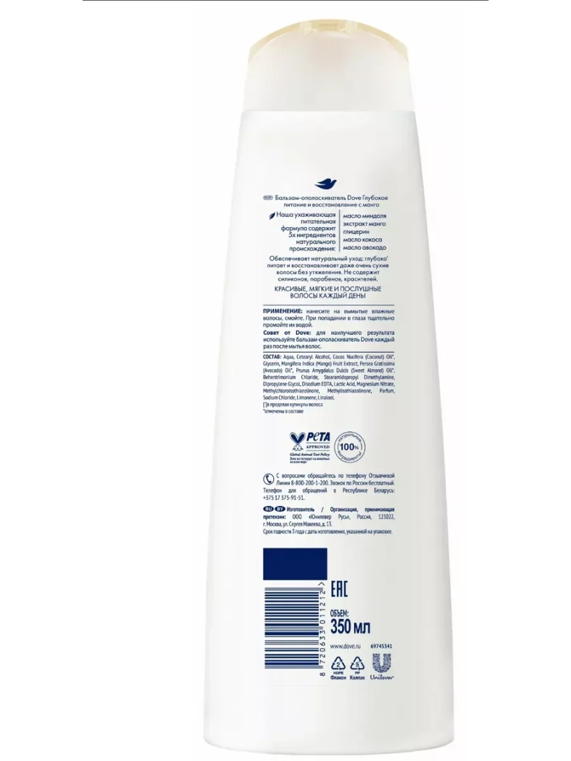 Полное наименование: ББальзам-ополаскиватель Дав / DOVE Глубокое питание и восстановление с манго 350мл. Производитель: Unilever Россия.Для восстановления даже очень сухих волос без утяжеления попробуйте бальзам-ополаскиватель Dove Глубокое' питание и восстановление с манго! Его ухаживающая питательная формула содержит 5 ингредиентов натурального происхождения: масло миндаля, экстракт манго, глицерин, масло кокоса и авокадо. Не содержит силиконов, парабенов, красителей. И обеспечивает натуральный уход. [']в пределах кутикулы волоса.
