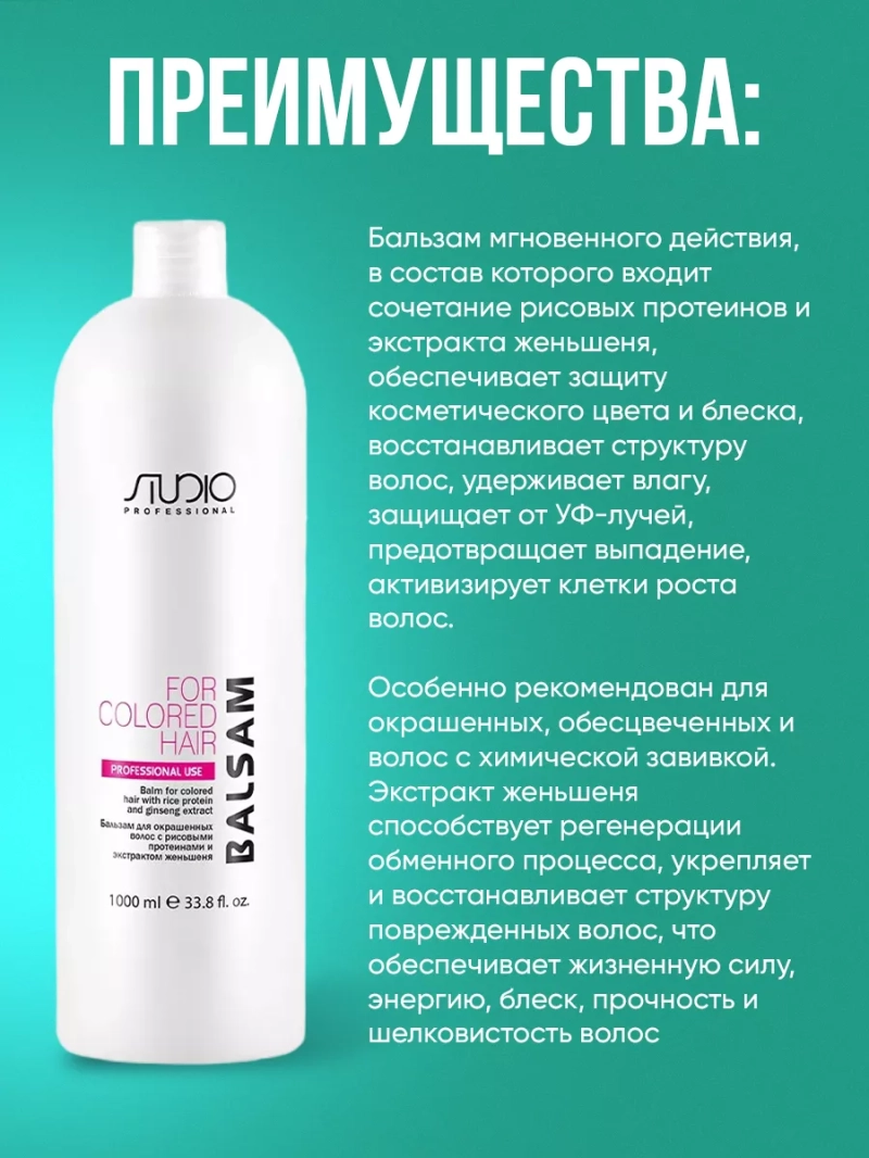 Бальзам для окрашенных волос с рисовыми протеинами и экстрактом женьшеня. Бальзам мгновенного действия, в состав которого входит сочетание рисовых протеинов и экстракта женьшеня, обеспечивает защиту косметического цвета и блеска, восстанавливает структуру волос, удерживает влагу, защищает от УФ-лучей, предотвращает выпадение, активизирует клетки роста волос. Особенно рекомендован для окрашенных, обесцвеченных и волос с химической завивкой. Экстракт женьшеня способствует регенерации обменного процесса, укрепляет и восстанавливает структуру поврежденных волос, что обеспечивает жизненную силу, энергию, блеск, прочность и шелковистость волос.ДЛЯ ПРОФЕССИОНАЛЬНОГО ПРИМЕНЕНИЯ. Способ применения: нанести бальзам на чистые, влажные волосы, равномерно распределить по полотну волос. Время выдержки 2-5 минут, затем смыть обильным количеством воды. Для термозащиты и защиты от воздействия окружающей среды используйте спрей-термозащиту для волос Invisible Care. Состав: Aqua (Water), Cetearyl Alcohol, Cetrimonium Chloride, Dipalmitoylethyl Hydroxyethylmonium Methosulfate, Parfum (Fragrance), Methoxy PEG/PPG-7/3 Aminopropyl Dimethicone, Dipropylene Glycol, Triethylene Glycol, Benzyl Alcohol, Propylene Glycol, Sodium Hydroxide, Methylchloroisothiazolinone Methylisothiazolinone, Hydrolyzed rice protein, CI 14700 (FD&C RED 4), Phenoxyethanol, Pentaerythrityl Tetra-di-t-butyl Hydroxyhydrocinnamate, Panax Ginseng Root Extract, Ethylhexylglycerin, Sodium Benzoate, Tetrasodium Glutamate Diacetate
