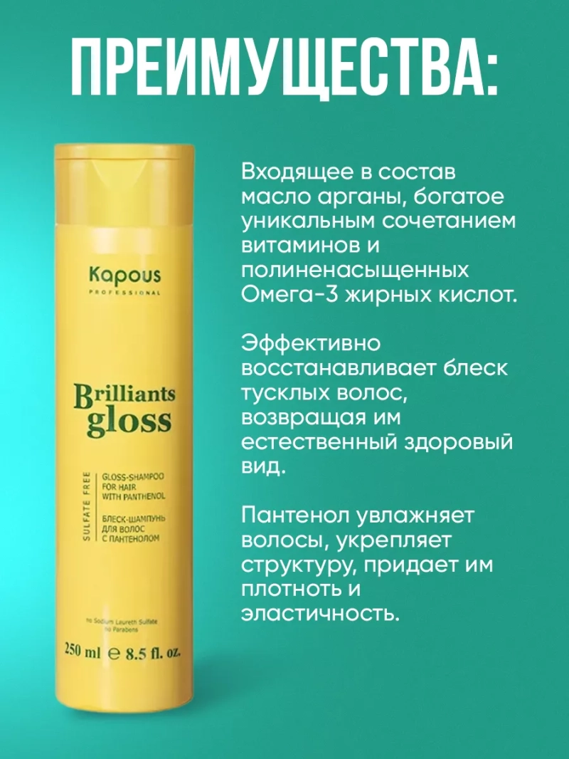 Блеск-шампунь "Brilliants gloss" исключительно подходит для ежедневного ухода за натуральными и окрашенными волосами. Эффективно очищает волосы от загрязнений и остатков укладочных средств, значительно усиливает устойчивость волоса к повреждающим воздействиям химических веществ, придает волосам шелковистость и блеск. Входящее в состав масло Арганы, богатое уникальным сочетанием витаминов и полиненасыщенных Омега-3 жирных кислот, эффективно восстанавливает блеск тусклых волос, возвращая им естественный здоровый вид. Пантенол увеличивает потенциал волос, стимулирует восстановительные процессы, укрепляет поверхность волос и придаёт им здоровый блеск. Способ применения: необходимое количество шампуня нанести на влажные волосы, промассировать 3-4 минуты, смыть водой. При необходимости процедуру повторить. Для оптимального ухода используйте бальзам "Brilliants gloss". Состав: AQUA (WATER), DISODIUM LAURETH SULFOSUCCINATE, PEG-18 GLYCERYL OLEATE/COCOATE, COCAMIDOPROPYL BETAINE, COCAMIDOPROPYLAMINE OXIDE, PARFUM (FRAGRANCE), CITRIC ACID, IMIDAZOLIDINYL UREA, POLYSORBATE 20, PANTHENOL, PROPYLENE GLYCOL, POLYQUATERNIUM-10, POTASSIUM SORBATE, SODIUM BENZOATE, ARGANIA SPINOSA KERNEL OIL, DISODIUM EDTA, POLYQUATERNIUM-7, LINSEED ACID