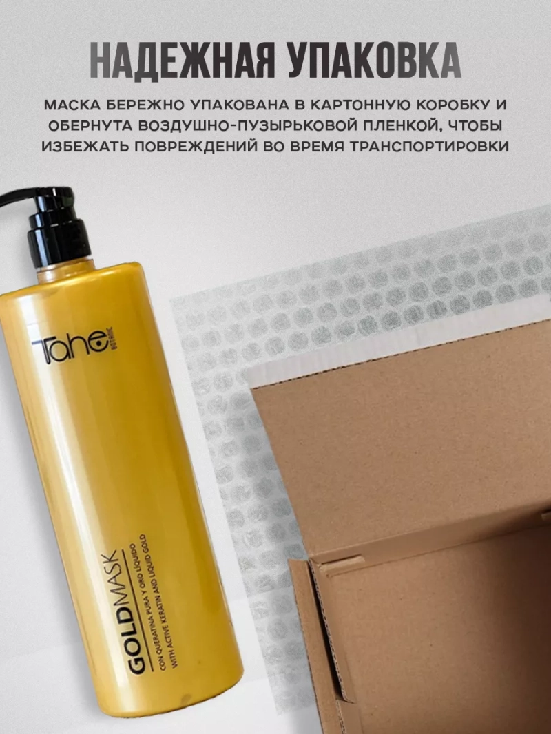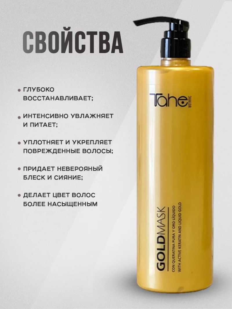 Профессиональная маска для волос Botanic Gold Mask от бренда Tahe содержит в своем составе кератин и жидкое золото. Эти два мощных ингредиента в питательной маске работают вместе, чтобы восстановить поврежденные волос волосы.
