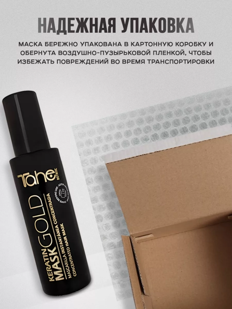 Botanic Keratin Gold Mask от бренда Tahe - несмываемая маска мгновенного действия, которая станет незаменимым средством в уходе за вашими локонами. Маска несмывашка для окрашенных волос содержит кератин и жидкое золото, которые помогут укрепить, питать и восстановить структуру волос, делая их здоровыми, блестящими и шелковистыми.