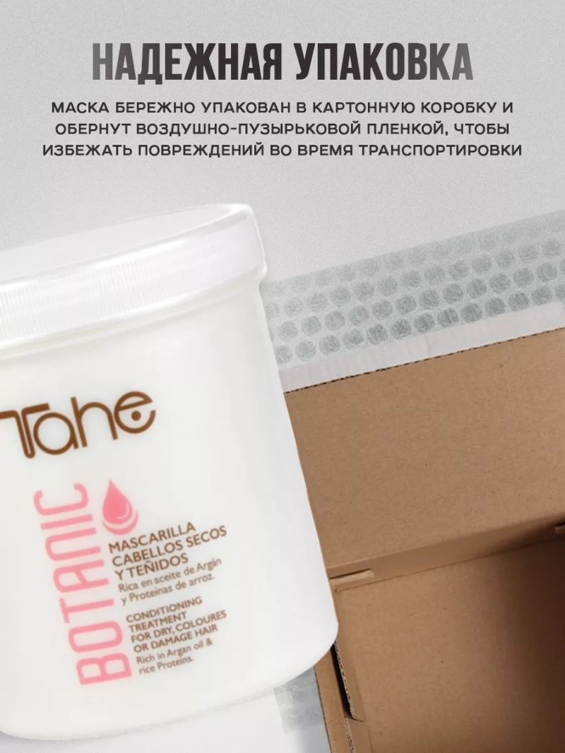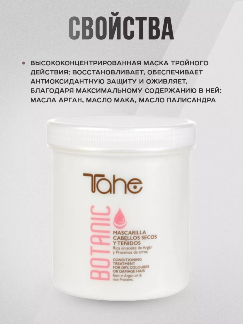 Маска для повреждённых волос от компании Tahe - это истинный спаситель для Ваших прядей. Насыщенная формула маски для сухих волос разработана специально для питания, увлажнения и восстановления Ваших волос. Органическая маска для волос содержит уникальный комплекс активных ингредиентов, которые работают в глубинных слоях волос, чтобы вернуть им здоровье, силу и красоту.Главным ингредиентом тонизирующей маски для волос является натуральное масло арганы, богатое витаминами. Аргановое масло питает волосы, увлажняет их и придает им шелковистость и блеск. Маска для окрашенных волос также содержит протеины пшеницы, которые укрепляют волосы, восстанавливают их структуру и предотвращают ломкость. Кроме того, в состав увлажняющей маски входит пантенол, который успокаивает кожу головы, устраняет зуд и шелушение. При использовании натуральной веганской маски, локоны становятся блестящими, мягкими на ощупь и здоровыми. Маска для волос с маслами оказывает сразу тройное действие: обеспечивает антиоксидантную защиту, оживляет и восстанавливает тонкие волосы.Волосы становятся более шелковистыми и упругими уже после первого применения восстанавливающей маски для блеска волос. Краска держится на волосах дольше, и цвет выглядит более насыщенным и ярким. Также ЭКО маска помогает защитить волосы от вредного воздействия окружающей среды, препятствуя образованию секущихся кончиков и предотвращая потерю влаги.Наносить органическую маску для секущихся кончиков волос простое и удобное. Регулярное использование питательной маски поможет Вам достичь оптимальных результатов.Не отказывайте своим волосам в заслуженном уходе. Вы заслуживаете только лучшее, и тонизирующая маска для сухих, тонированных и поврежденных волос готова предоставить Вам это. Дарите своим волосам прекрасное здоровье и ухоженность - Вы будете в восторге от результатов!