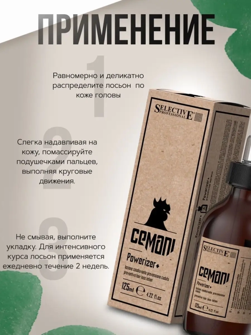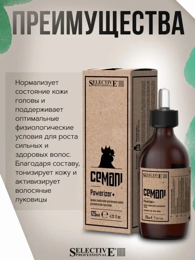 Selective Professional Cemani Powerizer+ Lotion Профилактический лосьон против выпадения волос, 125 мл, бутылка. Лосьон для профилактики выпадения волос Powerizer+ CEMANI (Selective Professional) улучшает микроциркуляцию крови в коже головы, создает приятное ощущение тепла и способствует проникновению активных ингредиентов. Нормализует состояние кожи головы и поддерживает оптимальные физиологические условия для роста сильных и здоровых волос. Благодаря составу, тонизирует кожу и активизирует волосяные луковицы.;Активные ингредиенты:;Экстракт листьев камелии китайской. Экстракт семян колы. Экстракт семян гуараны. Масло эвкалипта. Экстракт зеленых зерен кофе. Ментол. Экстракт мать-и-мачехи. Креатинин. Экстракт тысячелистника. Экстракт коры хинного дерева.;Способ применения: Равномерно и деликатно распределите лосьон Selective For Man Powerizer Lotion по коже головы. Слегка надавливая на кожу, помассируйте подушечками пальцев, выполняя круговые движения. Не смывая, выполните укладку. Для интенсивного курса лосьон применяется ежедневно течение 2 недель. После этого продолжайте наносить лосьон 3 раза в неделю в течение еще 6 недель. Повторяйте курс 2 раза в год, особенно весной и осенью. Результат: Selective For Man Powerizer Lotion предотвращает интенсивную потерю волос и борется с причинами выпадения, способствует восстановлению волосяных луковиц, делает их более сильными и здоровыми. Эффект: активация роста, питание, придание блеска, придание эластичности, увлажнение, укрепление. Способ применения: равномерно нанести лосьон на кожу головы мягкими круговыми движениями, слегка надавливая и массируя ее подушечками пальцев. Не смывать. Для лечения рекомендуется применять лосьон ежедневно в течение 2 недель. Курс рекомендуется проводить дважды в год, особенно в период межсезонья. Для профилактики применять 3 раза в неделю на протяжении 6 недель.