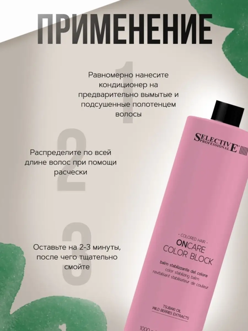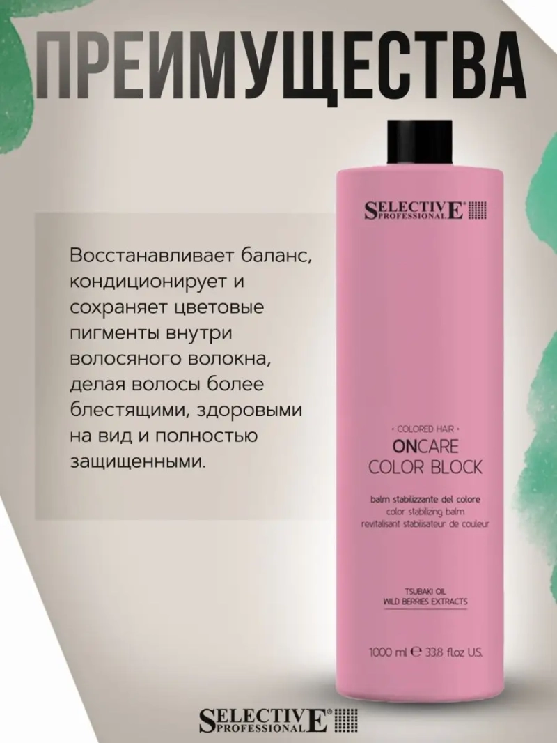Selective Oncare Color Block Stabilizing Balm - Кондиционер для стабилизации цвета 1000 мл. Восстанавливает баланс, кондиционирует и сохраняет цветовые пигменты внутри волосяного волокна, делая волосы более блестящими, здоровыми на вид и полностью защищенными. Применение: Нанесите 1-2 дозы Кондиционера для стабилизации цвета Color Block Stabilizing Balm на ладонь. Разогрейте средство в ладонях и мягкими массирующими движениями нанесите по всей длине предварительно вымытых волос, затем расчешите для равномерного распределения. Оставьте продукт на несколько минут, в зависимости от состояния волос. Сэмульгируйте, добавив немного воды, и тщательно смойте.
