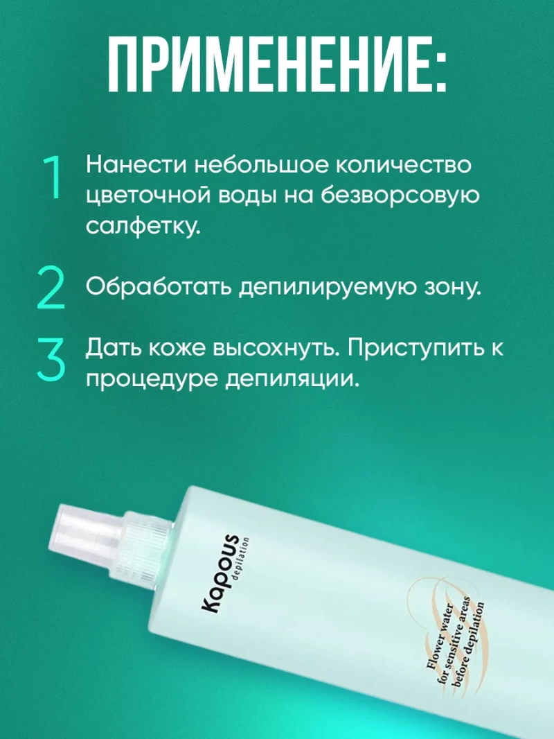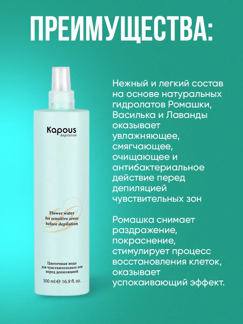 Цветочная вода для чувствительных зон перед депиляцией эффективное средство для бережной очистки и подготовки кожи перед процедурой удаления нежелательных волос. На основе натуральных гидролатов Ромашки, Василька и Лаванды, этот нежный и легкий состав обеспечивает увлажнение, смягчение, очищение и антибактериальное действие, идеально подходящее для депиляции чувствительных зон, включая подмышечные впадины, бикини и лицо. Ромашка - настоящее спасение для раздраженной кожи. Этот цветок помогает снять покраснение, снимает раздражение и стимулирует процесс восстановления клеток, создавая успокаивающий эффект на коже. Василёк обладает антисептическим свойством, защищая кожу от возможной инфекции. Лаванда, в свою очередь, бережно и глубоко очищает поры от различных загрязнений, устраняя сухость и шелушение.Подходит для всех типов кожи, цветочная вода рекомендуется к использованию после процедуры шугаринга, чтобы удалить оставшийся липкий слой. Ее уникальный активный состав, включающий экстракты василька, лаванды и ромашки, обеспечивает максимальный уход и защиту кожи во время депиляции.В составе товара вода, глицерин, аллантоин, гидролаты лаванды, ромашки и василька, пантенол, ниацинамид, аскорбиновая кислота, салициловая кислота, гликоловая кислота, молочная кислота, гиалуронат натрия, кокоамфоацетат натрия, бензиловый спирт, этилгексилглицерин, токоферол, PEG-40 гидрогенизированное касторовое масло, ароматизатор, лимонная кислота. Способ применения прост и удобен: нанесите небольшое количество цветочной воды на безворсовую салфетку и обработайте необходимую зону перед процедурой депиляции. Дайте коже высохнуть и приступайте к депиляции. Данный товар занимает почетное 6 место в рейтинге косметических вод для тела 2023 года. Высокое качество, натуральный состав и эффективность - вот то, что отличает цветочную воду для чувствительных зон перед депиляцией от других аналогов на рынке.