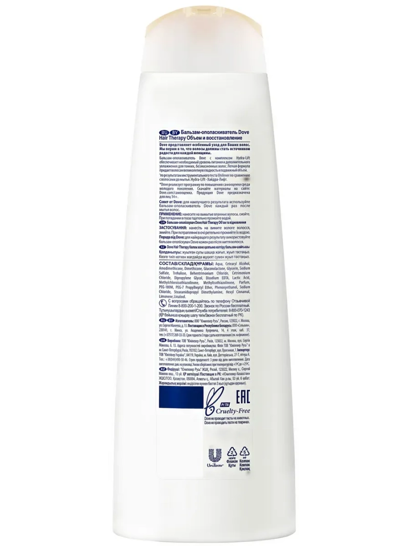 Полное наименование: DOVE / Дав HAIR THERAPY Бальзам-ополаскиватель Объем и восстановление 350мл. Производитель: Unilever Россия. Теперь любимый бальзам для волос Dove в большом объеме! Обладательницы тонких волос часто страдают отсутствием объема волос от корней. Бальзам-ополаскиватель Dove Объем и восстановление без утяжеления с комплексом Hydra-Lift обеспечивает необходимый уровень питания и дополнительного увлажнения для тонких, безжизненных волос. Легкая формула придает волосам великолепную гладкость и плотный подвижный объем. Придает волосам в 2 раза больше объема без утяжеления. С каждым разом волосы выглядят более пышными, густыми и упругими! Dove дарит особенный уход для Ваших волос. Мы верим в то, что волосы должны стать источником радости для каждой женщины. Совет от Dove: для наилучшего результата используйте бальзам-ополаскиватель Dove каждый раз после мытья волос. *по результатам инструментального теста Unilever по сравнению с волосами до мытья, Великобритания, 2013. Hydra-Lift - Хайдра-Лифт. Сегодня бренд Dove - это средства по ухода за телом и волосами, любимые более чем в 80 странах мира. Особенное питание, которое дарит вашим волосам шампунь Dove помогает делать их более здоровыми и красивыми с каждым днем. Dove - первые средства для волос, которые не просто борются с повреждениями волос, а предотвращают их! Не боритесь с повреждениями волос, предотвращайте их вместе с Dove. Dove не проводит тесты на животных