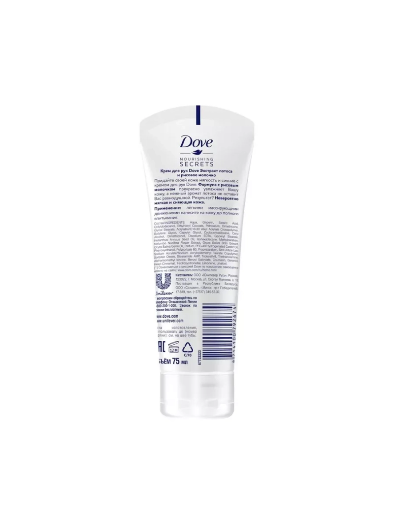 Кремы для рук Секреты питательного ухода, созданные по мотивам ритуалов красоты женщин из разных уголков планеты, содержат экзотические ингредиенты и обладают неповторимыми ароматами.** Забота о красоте рук так же важна, как и ежедневный уход за кожей лица. Откройте для себя секреты красоты японских женщин с кремом для рук Dove Экстракт Лотоса и Рисовое Молочко. Формула крема обогащена экстрактом цветков лотоса и рисовым молочком, которые использовались в Японских ритуалах красоты на протяжении тысячи лет для придания коже сияния. Нежная формула крема для рук питает сухую кожу и защищает ее от потери влаги благодаря содержанию DeepCare Complex – комплекса глубокого* ухода от Dove, включающего в себя родственные коже компоненты для ее питания и увлажнения в сочетании с экзотическими ингредиентами, придающими ей здоровое сияние и восхитительную нежность. А экстракт лотоса оставляет на коже вуаль нежного и сладкого цветочного аромата. Пробудите свою кожу с этим средством, вдохновлённым SPA-ритуалами из самой Японии. Результат? Сияющая и шелковистая кожа, которой хочется любоваться. Мягкими массажными движениями равномерно нанесите крем на чистую сухую кожу рук и равномерно распределите. Крем подходит для всех типов кожи. Dove не тестируется на животных во всём мире. *в пределах эпидермиса. **в ассортименте Unilever.