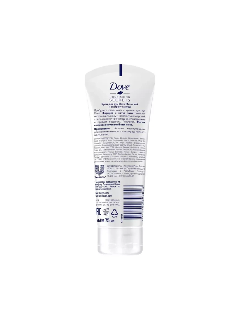 Полное наименование: DOVE / Дав Крем для рук Матча чай и экстракт сакуры 75мл. Производитель: Unilever Россия. Позаботьтесь о своей коже с кремом для рук Dove. Формула с японским чаем матча подарит Вашей коже восхитительное увлажнение и мягкость, а лёгкий цветочный аромат не оставит Вас равнодушной. Результат? Восстановленная и невероятно мягкая кожа.
