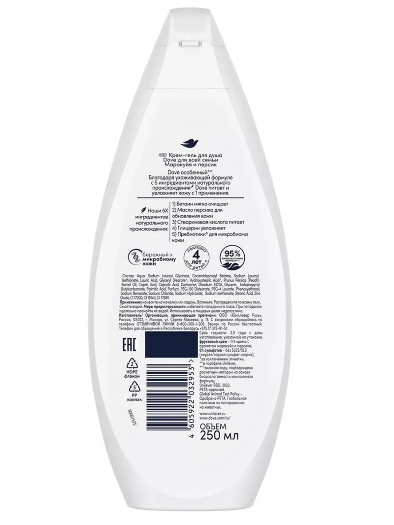 Полное наименование: DOVE Крем-гель для душа для всей семьи МАРАКУЙЯ И ПЕРСИК 250 мл. Производитель: Unilever Россия. Откройте для себя сочную новинку от Dove – бессульфатный крем-гель для всей семьи Маракуйя и персик. Он насыщает и увлажняет кожу уже после первого применения благодаря формуле с 5-ю ингредиентам натурального происхождения: бетаин, масло персика, пребиотики, глицерин, стеариновая кислота. Подходит для детей с 4-х лет. бессульфатный - без SLES/SLS (лаурет/лаурил сульфат натрия).