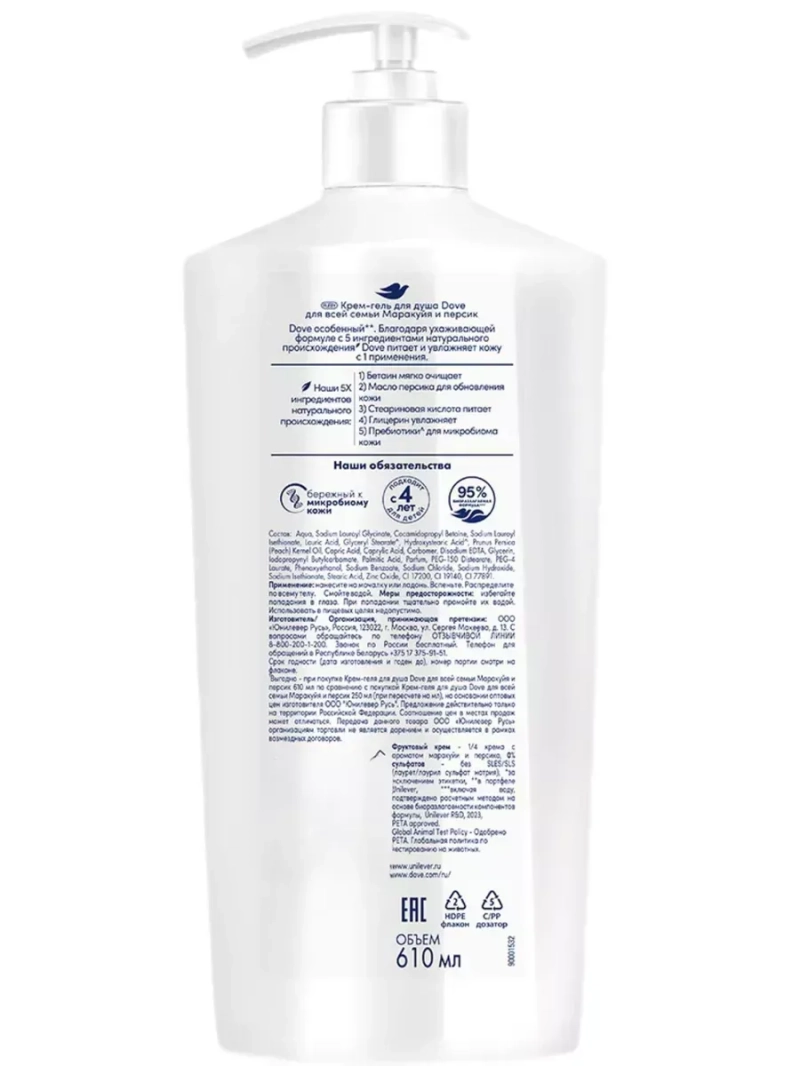 Полное наименование: DOVE Крем-гель для душа для всей семьи МАРАКУЙЯ И ПЕРСИК 610 мл. Производитель: Unilever Россия. Откройте для себя сочную новинку от Dove – бессульфатный крем-гель для всей семьи Маракуйя и персик. Он насыщает и увлажняет кожу уже после первого применения благодаря формуле с 5-ю ингредиентам натурального происхождения: бетаин, масло персика, пребиотики, глицерин, стеариновая кислота. Подходит для детей с 4-х лет. бессульфатный - без SLES/SLS (лаурет/лаурил сульфат натрия).