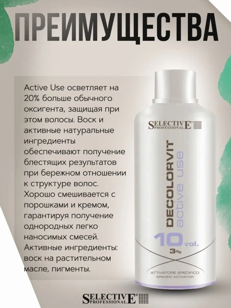 Активатор специальный 3% / DECOLORVIT ACTIVE USE 750 мл. Специальная окисляющая эмульсия активатор для продуктов линии Decolorvit System. Содержит пигменты, устраняющие нежелательный желтый оттенок. Active Use осветляет на 20% больше обычного оксигента, защищая при этом волосы. Воск и активные натуральные ингредиенты обеспечивают получение блестящих результатов при бережном отношении к структуре волос. Хорошо смешивается с порошками и кремом, гарантируя получение однородных легко наносимых смесей.Состав: AQUA, HYDROGEN PEROXIDE, CETEARYL ALCOHOL, PEG-40 HYDROGENATED CASTOR OIL, PARAFFINUM LIQUIDUM, CETRIMONIUM CHLORIDE, PEG-10 RAPESEED STEROL, PHOSPHORIC ACID, ETIDRONIC ACID, VIOLET 43, SODIUM METHYLPARABEN, OXYQUINOLINE SULFATE