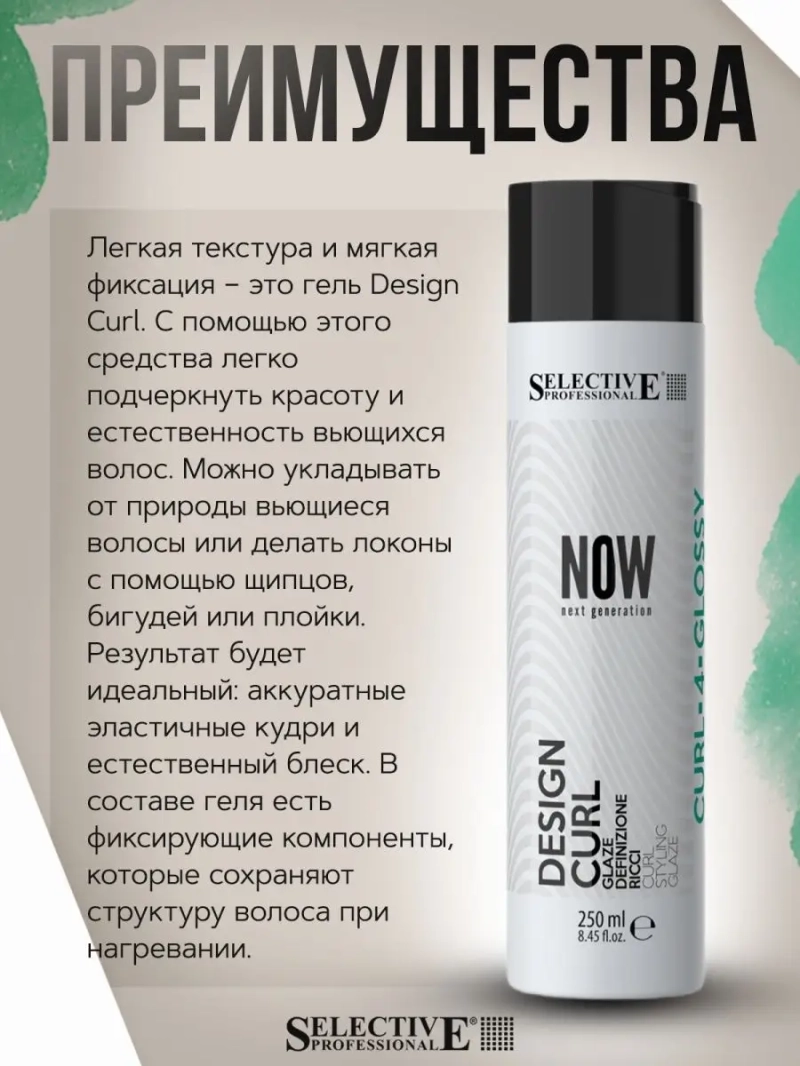 Селектив для создания локонов Desing Curl 250 мл (Selective, Now Next Generation). Now Design curl – моделирующая жидкость для создания и отличного выделения локонов. Придает натуральный эффект эластичности. Выделяет детали, устраняет эффект пушистости, придает волосам блеск. Рекомендуется для укладки волос с помощью фена, бигуди или диффузора. Защищает волосы от негативного влияния УФ-лучей. Идеальна для создания кудрявых причесок с натуральным эластичным эффектом. Фруктовый аромат. Степень фиксации: 4 сильная фиксация. Активные компоненты: Пчелиный воск, экстракт мяты перечной, пантенол, масло гуараны, этидроновая кислота, касторовое масло, аминокислотный комплекс, глицерин, УФ-фильтры.; Применение: Нанести средство по прядям от корней и по длине волос. Волосы должны быть равномерно влажные. Приступить к укладке диффузором. Идеален для создания четких завитков после химической завивки Mildtexture.