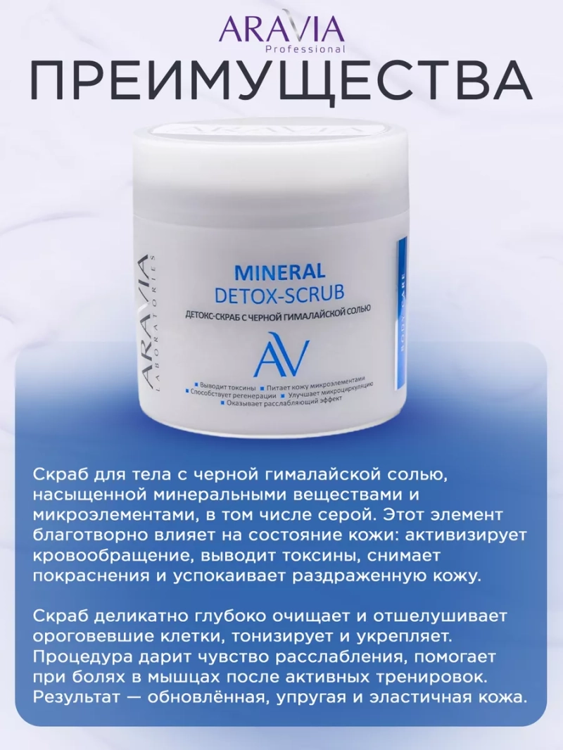 ДЕТОКС-СКРАБ С ЧЁРНОЙ ГИМАЛАЙСКОЙ СОЛЬЮ MINERAL DETOX-SCRUB, 300 МЛ. Скраб для тела с черной гималайской солью, насыщенной минеральными веществами и микроэлементами, в том числе серой. Этот элемент благотворно влияет на состояние кожи: активизирует кровообращение, выводит токсины, снимает покраснения и успокаивает раздраженную кожу. Скраб деликатно глубоко очищает и отшелушивает ороговевшие клетки, тонизирует и укрепляет. Процедура дарит чувство расслабления, помогает при болях в мышцах после активных тренировок. Результат — обновлённая, упругая и эластичная кожа. Назначение: глубокое очищение, подготовка кожи к загару и обертыванию. Рекомендации для использования: рекомендуется использовать 1-2 раза в неделю. Биоактивный состав: черная гималайская соль, морская соль, масло ши, масло сои. Черная гималайская соль удаляет мертвые клетки, при этом не пересушивая и не травмируя кожу. Оказывает омолаживающий эффект, борется с сухостью и шелушением кожи, снижает отёчность. Морская соль обладает антицеллюлитным, тонизирующим и противовоспалительным действием. Стимулирует микроциркуляцию и повышает упругость кожи. Масло ши обладает выраженным антиоксидантным действием, стимулирует замедлившиеся процессы метаболизма увядающей кожи и регенерацию клеток. Укрепляет ослабленную кожу, делает ее более плотной и эластичной. Масло сои — источник лецитина и витаминов. Увлажняет, смягчает кожу, замедляет процесс увядания. Восстанавливает защитный эпидермальный барьер и влагоудерживающую способность кожи. СПОСОБ ПРИМЕНЕНИЯ: Нанесите скраб на слегка увлажненную кожу, помассируйте в течение 2-3 минут. Смойте остатки теплой водой. Меры предосторожности: не наносить на слизистую. С осторожностью использовать на зоне живота и внутренней поверхности бедер. Избегать попадания в глаза и не наносить на поврежденную кожу.
