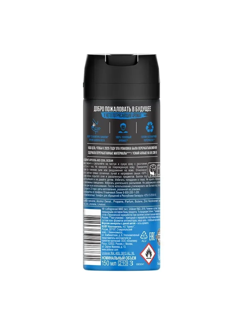 Полное наименование: Дезодорант аэрозоль AXE COOL OCEAN 150мл. Производитель: Unilever Россия. Попробуй освежающую новинку от AXE* с аккордами морских минералов и дикой мяты – дезодорант-аэрозоль Cool Ocean. Притягательный дерзкий 100% топовый* акватический аромат, который наверняка придется тебе по вкусу. Новая* технология против запаха пота эффективна до 48 часов**. Она препятствует появлению неприятного запаха, не содержит солей алюминия и позволяет коже дышать. *в линейке продукции Unilever. **48ч unfragranced MMS тест, Unilever R&D, 2018. Cool Ocean – прохладный океан.