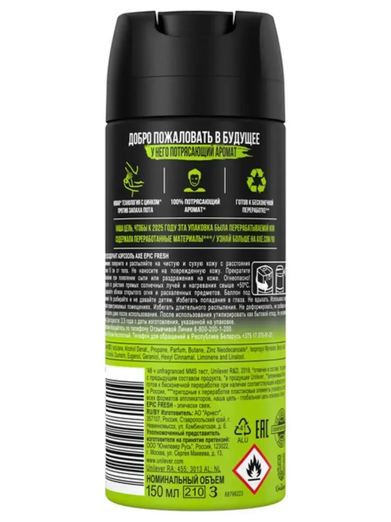 Полное наименование: Дезодорант аэрозоль AXE EPIC FRESH 150 мл. Производитель: Unilever Россия. Зарядись самой долгой свежестью от AXE* с новинкой бренда – дезодорантом-аэрозолем Epic Fresh. Современный фужерный аромат, который раскрывается акватическими и фруктовыми аккордами, поддержанными нотами кардамона. В основе формулы – антибактериальная технология ZINC ZAP, – твоя усиленная защита от неприятного запаха на основе цинка. Она препятствует появлению неприятного запаха, не содержит солей алюминия и позволяет коже дышать. Забудь про следы на одежде и неприятный запах. Только ощущение свежести, и крутой аромат, который привлечет к тебе еще больше нужного внимания. Вокруг тебя целый мир, полный фантастических возможностей. Зарядись уверенностью в своей привлекательности с AXE, не оставайся на скамейке запасных.