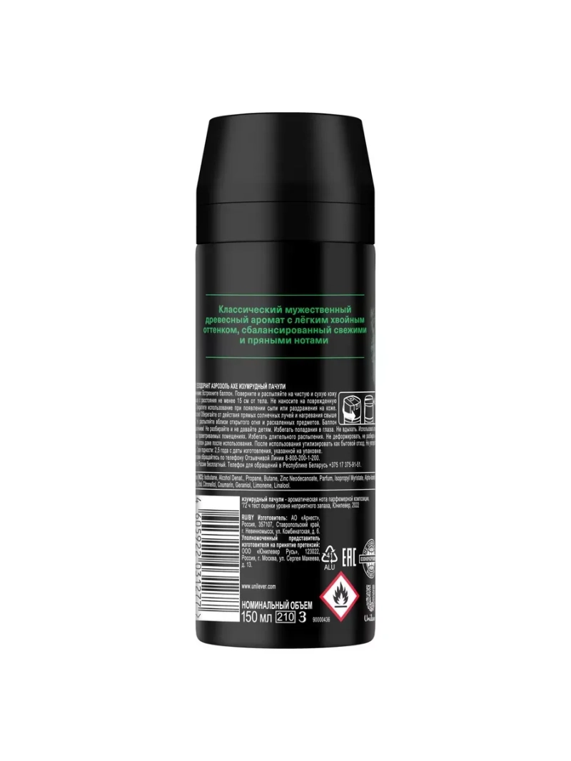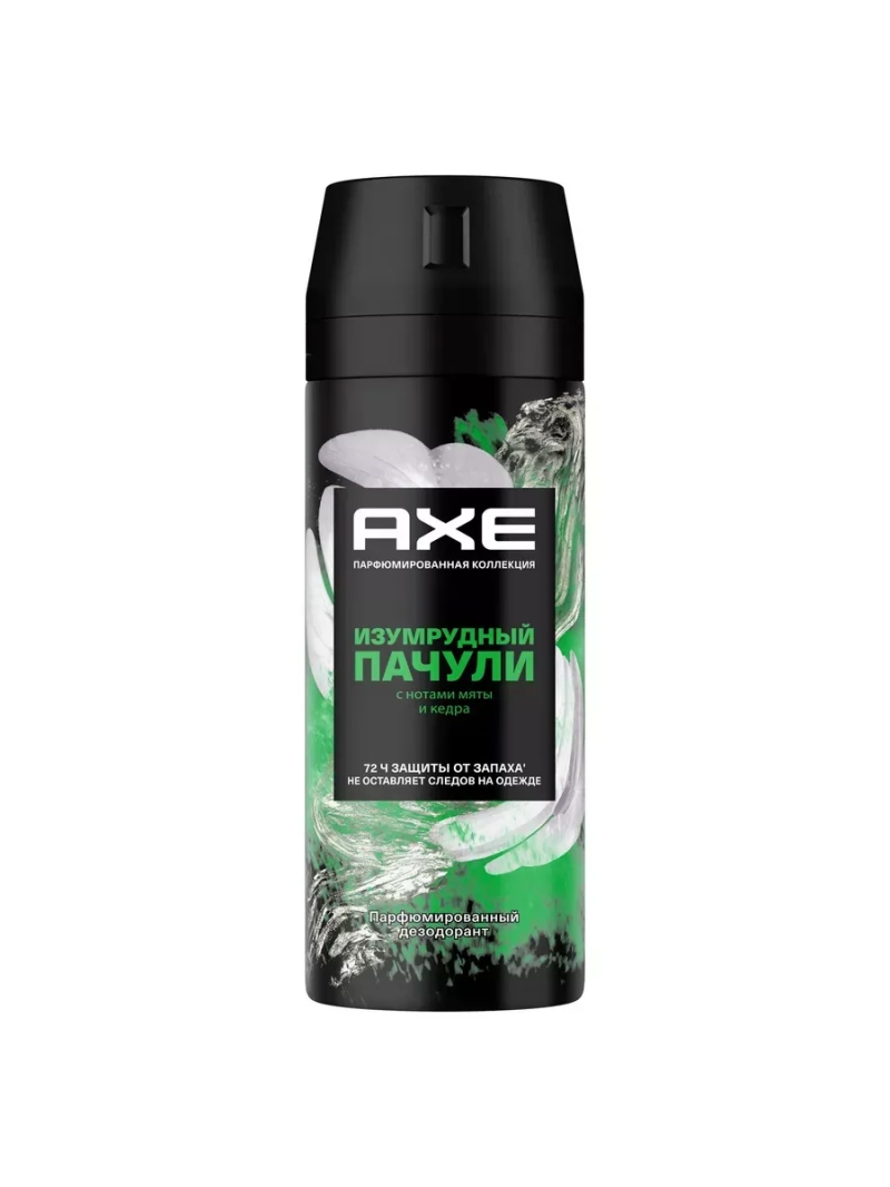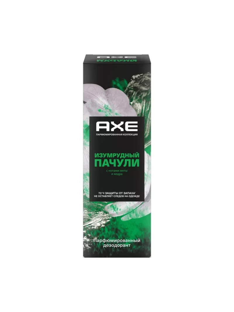 Полное наименование: Дезодорант аэрозоль AXE Изумрудный пачули, 150 мл. Производитель: Unilever Россия. Для ярких и независимых натур, которые предпочитают классические ароматы, но не боятся оказаться в центре внимания — дезодорант аэрозоль AXE Изумрудный пачули. На старте дезодорант с пачули открывается перечной мятой, лавандой и пихтовым бальзамом. Раскрываясь в течение дня, он превращается в пряную смесь кардамона, черного перца, мускатного шалфея и герани. А затем — в базовый, завершающий аккорд, составленный из смолистых нот амириса, кедра и пачули.