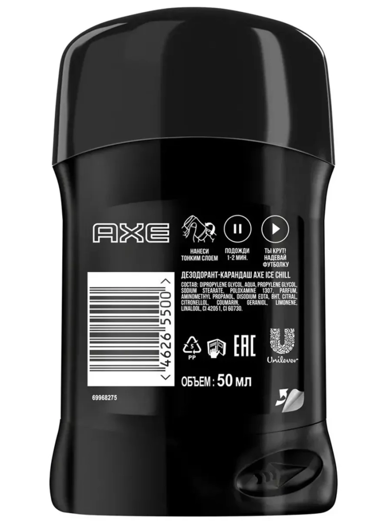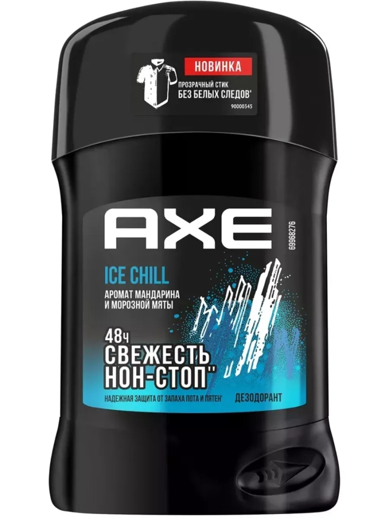 Начни утро с дезодоранта-карандаш AXE Ice Chill с топовым* ароматом акватики, цитрусовых и древесными нотками. Ведь он создан специально для горячих парней. Полупрозрачная текстура синего цвета на водной основе высыхает за пару минут и обеспечивает до 48 часов свежести нон-стоп'', надежно защищает от запаха пота и пятен'. Без солей алюминия. * в портфеле продукции ООО Юнилевер Русь. ' Обусловленных наличием солей алюминия. '' 48 ч тест оценки уровня неприятного запаха, Юнилевер, 2010 г.