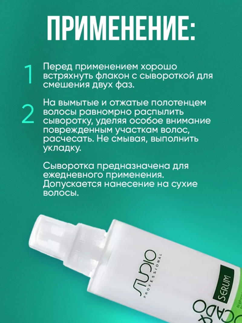 Формула двухфазной сыворотки на основе масел Авокадо и Оливы специально разработана для сухих, ломких и поврежденных волос. Сыворотка защищает волосы от воздействия внешних факторов, обеспечивая интенсивное увлажнение. Комплекс масел Авокадо и Оливы богат активными компонентами (Омега 3 и 6 жирные кислоты), которые оказывают восстанавливающий, увлажняющий и укрепляющий эффект, делая волосы... Формула двухфазной сыворотки на основе масел Авокадо и Оливы специально разработана для сухих, ломких и поврежденных волос. Сыворотка защищает волосы от воздействия внешних факторов, обеспечивая интенсивное увлажнение. Комплекс масел Авокадо и Оливы богат активными компонентами (Омега 3 и 6 жирные кислоты), которые оказывают восстанавливающий, увлажняющий и укрепляющий эффект, делая волосы эластичными, шелковистыми и блестящими. Сыворотка облегчает расчесывание, снимает статическое электричество. Способ применения: Перед применением хорошо встряхнуть флакон с сывороткой для смешения двух фаз. На вымытые и отжатые полотенцем волосы равномерно распылить сыворотку, уделяя особое внимание поврежденным участкам волос, расчесать. Не смывая, выполнить укладку. Сыворотка предназначена для ежедневного применения. Допускается нанесение на сухие волосы.