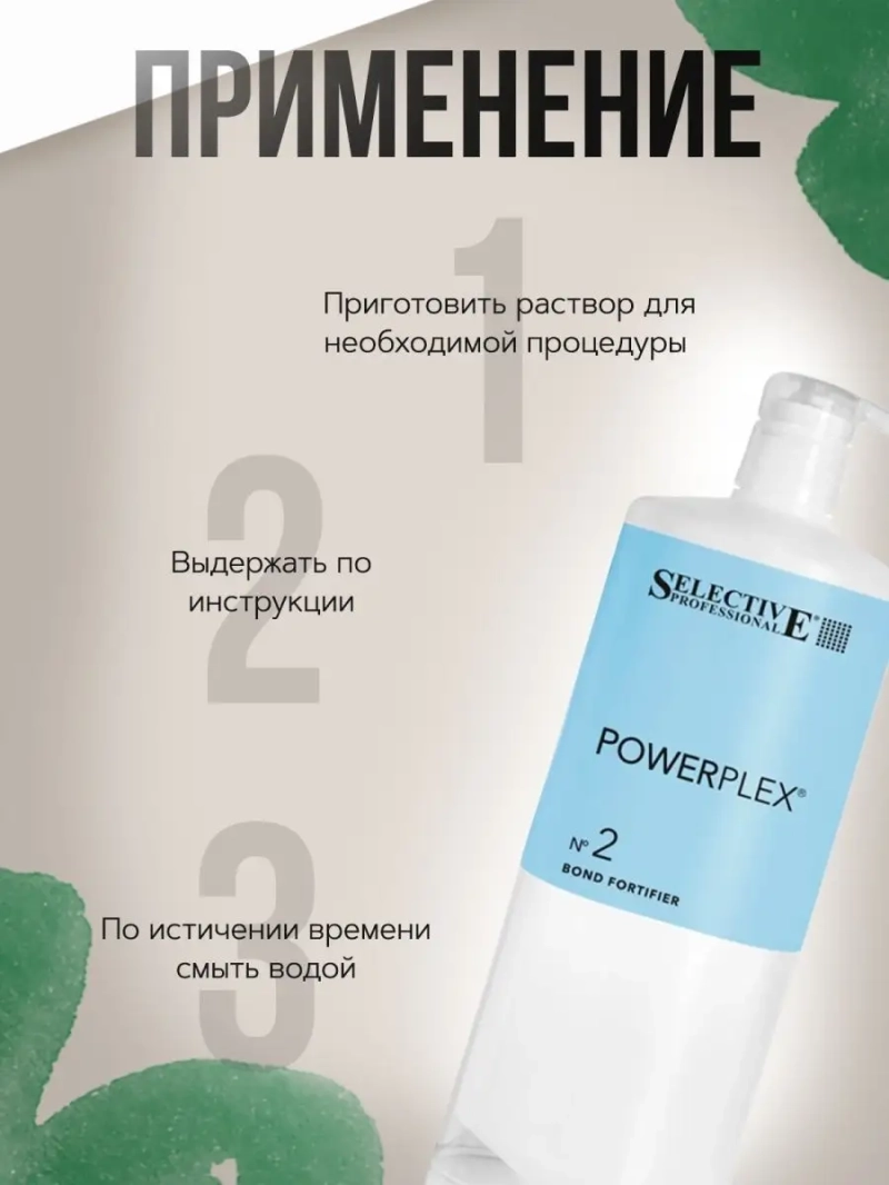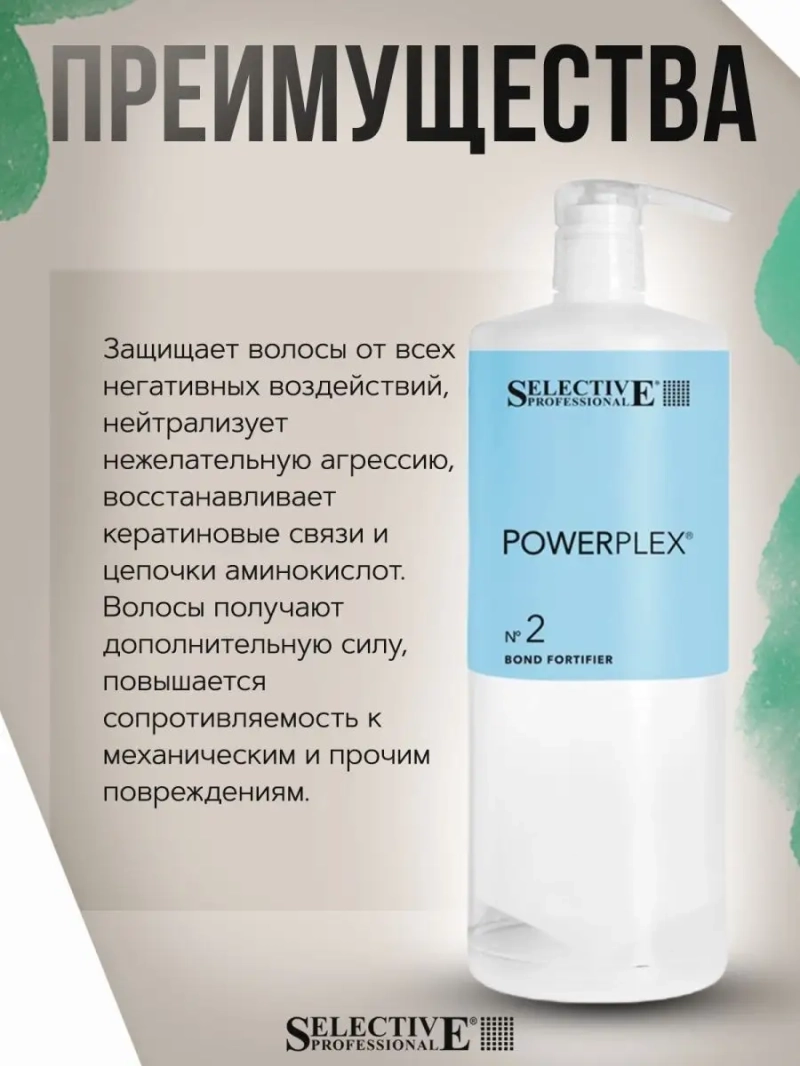 Состав POWERPLEX включает активные компоненты природного происхождения, которые проникают в стержень волоса, защищая его кератиновые связи и восстанавливая поврежденную структуру. Это обеспечивает увеличение эластичности и прочности волос, предотвращая механические повреждения. Действие Powerplex Bond Fortifier от Selective заключается в укреплении новых связей, созданных с помощью Powerplex 1-го шага (Bond Creator), а также в питании и увлажнении волос, что подчеркивает эстетические результаты любых технических процедур.