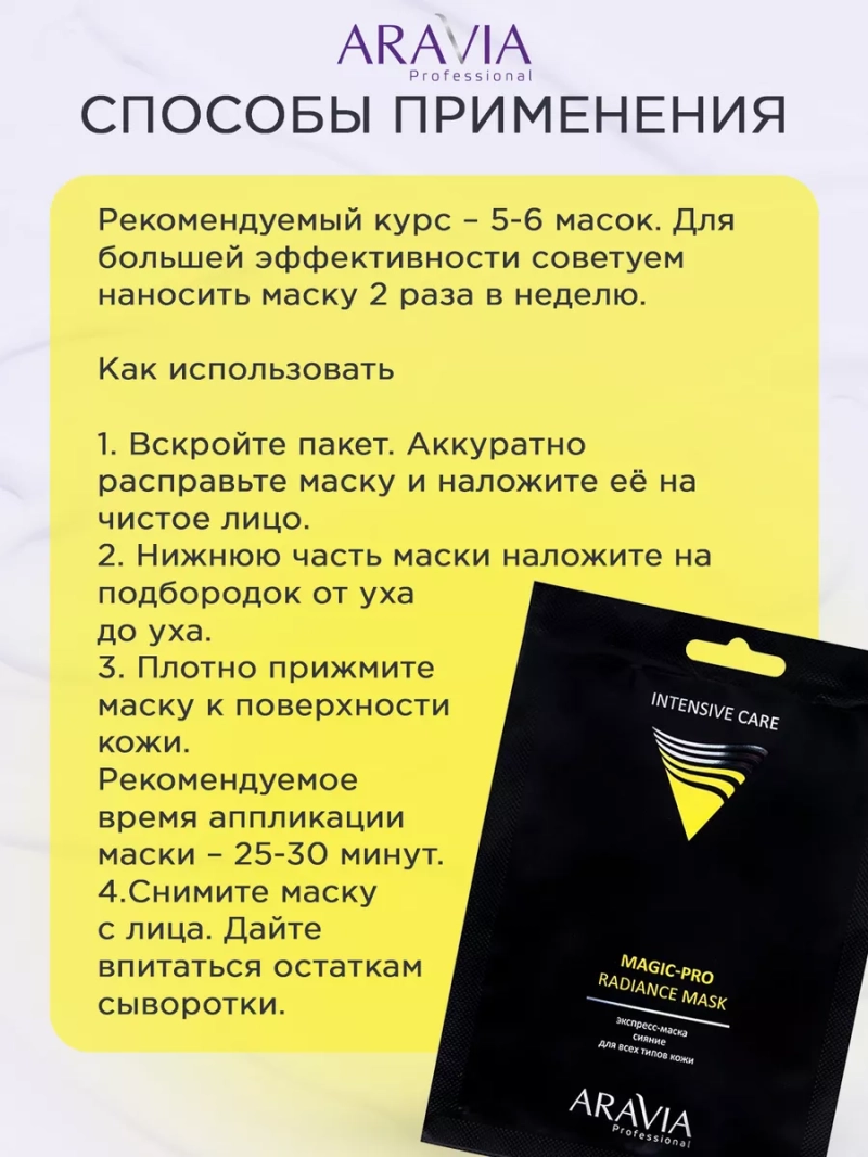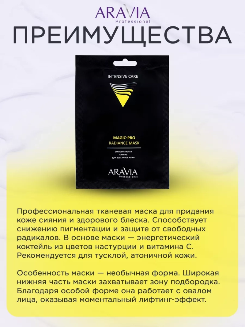 ЭКСПРЕСС-МАСКА СИЯНИЕ ДЛЯ ВСЕХ ТИПОВ КОЖИ MAGIC – PRO RADIANCE MASK. Профессиональная тканевая маска для придания коже сияния и здорового блеска. Способствует снижению пигментации и защите от свободных радикалов. В основе маски — энергетический коктейль из цветов настурции и витамина C. Рекомендуется для тусклой, атоничной кожи. Особенность маски — необычная форма. Широкая нижняя часть маски захватывает зону подбородка. Благодаря особой форме она работает с овалом лица, оказывая моментальный лифтинг-эффект. Маска запечатывает активные ингредиенты в поверхности кожи и блокирует быстрое испарение драгоценной влаги с кожи. Эффективное сочетание профессиональной сыворотки и тканевой маски дает выраженный результат, заметный после первого применения. Назначение: рекомендуется для тусклой, атоничной кожи с целью улучшения состояния и внешнего вида кожи. Рекомендации для использования: Профессиональный уход (процедурный): использование под аппаратные процедуры (фонофорез) и для проведения пластического массажа. Биоактивный состав: витамин С, экстракт настурции, гиалуроновая кислота, растительные полисахариды. Состав продукта (INCI): Deionized Water, Butylene Glycol, Tropaeolum majus Flower Extract, Polysorbate 20, Glyceryl Laurate, Cellulose Gum, Carragenan, Ceratonia Siliqua Gum, Sucrose, Sodium Hyaluronate, Ascorbyl Glucoside, Phenoxyethanol, Disodium EDTA, Perfume. СПОСОБ ПРИМЕННЕНИЯ: Вскройте пакет с маской. Аккуратно расправьте маску и наложите её на чистое лицо, плотно прижмите ткань к поверхности кожи. Нижнюю часть маски наложите на нижнюю часть подбородка от уха до уха. Прижмите маску к поверхности кожи. Рекомендуемое время аппликации маски 25-30 минут. Снимите маску с лица и утилизируйте. Сыворотка не требует смывания водой, дайте впитаться остаткам. Меры предосторожности: не наносите на поврежденную кожу и избегайте попадания в глаза. При попадании в глаза тщательно промойте водой. Перед применением тестируйте на небольшом участке кожи.