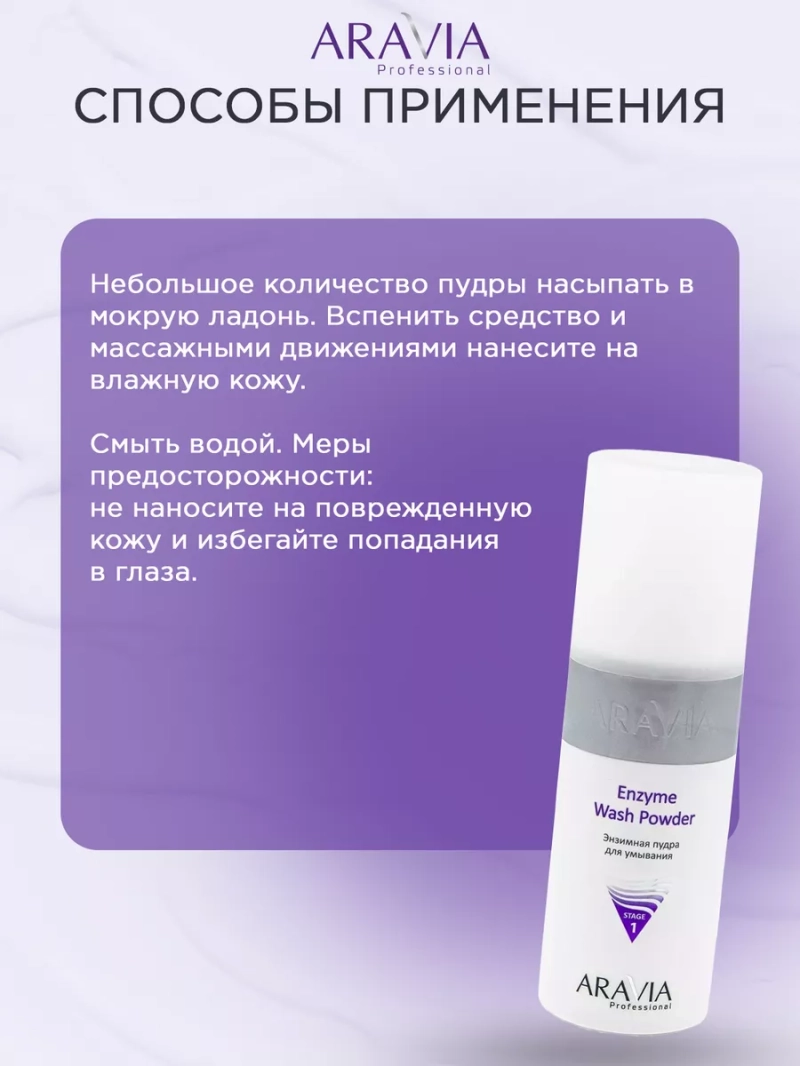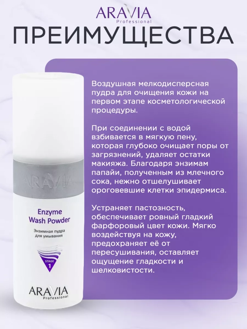 ЭНЗИМНАЯ ПУДРА ДЛЯ УМЫВАНИЯ ENZYME WASH POWDER, 150 МЛ. Воздушная мелкодисперсная пудра для очищения кожи на первом этапе косметологической процедуры. При соединении с водой взбивается в мягкую пену, которая глубоко очищает поры от загрязнений, удаляет остатки макияжа. Благодаря энзимам папайи, полученным из млечного сока, нежно отшелушивает ороговевшие клетки эпидермиса. Устраняет пастозность, обеспечивает ровный гладкий фарфоровый цвет кожи. Мягко воздействуя на кожу, предохраняет её от пересушивания, оставляет ощущение гладкости и шелковистости. Идеально подходит для всех типов кожи, в том числе чувствительной. Назначение: для очищения всех типов кожи, в том числе чувствительной, на первом этапе косметологической процедуры. Рекомендации для использования: Профессиональный уход: первый этап косметологической процедуры — очищение кожи. Домашний уход: в качестве ежедневного ухода для жирной кожи, 1-3 р/нед для всех типов кожи. Биоактивный состав: папаин, каолин, ксантановая камедь. Состав продукта (INCI): Disodium Lauryl Sulfosuccinate, Papain, Kaolin, Starch, Maltodextrin, Calcium Carbonate, Xanthan Gum, Talc, Parfum. Для профессионального применения. Небольшое количество пудры насыпать в мокрую ладонь. Вспенить средство и массажными движениями нанесите на влажную кожу. Смыть водой. Меры предосторожности: не наносите на поврежденную кожу и избегайте попадания в глаза. При попадании в глаза тщательно промойте водой. Перед применением тестируйте на небольшом участке кожи.