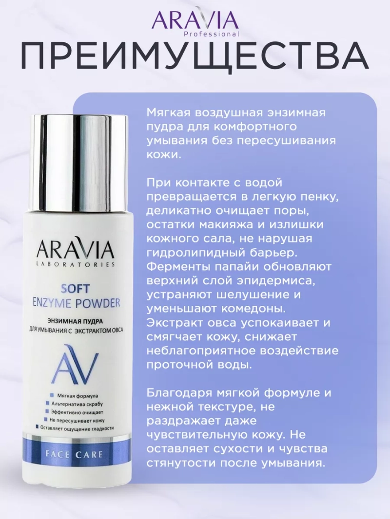 ЭНЗИМНАЯ ПУДРА ДЛЯ УМЫВАНИЯ С ЭКСТРАКТОМ ОВСА SOFT ENZYME POWDER, 150 МЛ. Мягкая воздушная энзимная пудра для комфортного умывания без пересушивания кожи. При контакте с водой превращается в легкую пенку, деликатно очищает поры, остатки макияжа и излишки кожного сала, не нарушая гидролипидный барьер. Ферменты папайи обновляют верхний слой эпидермиса, устраняют шелушение и уменьшают комедоны. Экстракт овса успокаивает и смягчает кожу, снижает неблагоприятное воздействие проточной воды. Благодаря мягкой формуле и нежной текстуре, не раздражает даже чувствительную кожу. Не оставляет сухости и чувства стянутости после умывания. Пудра усиливает действие дальнейшего ухода, выравнивает цвет лица, оставляет ощущение гладкой фарфоровой кожи. Назначение: глубокое очищение кожи. Рекомендации для использования: рекомендуется использовать 2-3 раза в неделю. ДЕЙСТВИЕ: очищающее, отшелушивающее, уменьшает комедоны, устраняет шелушения, мягко полирует, выравнивает тон. Экстракт овса — мелкоизмельченная овсяная пудра, содержит аминокислоты, витамины, минеральные веществами, цинк. Тонизирует, смягчает, увлажняет, выравнивает рельеф кожи, ускоряет процессы заживления, обладает противовоспалительным эффектом. Каолин — вытягивает излишки кожного сала и загрязнения, контролирует работу сальных желез, оказывает бактерицидное, противовоспалительное действие. Обладает мягким отшелушивающим действием, стимулирует регенерацию клеток и насыщает их кислородом, способствует образованию коллагена, придающего тканям эластичность. СПОСОБ ПРИМЕНЕНИЯ: Небольшое количество пудры насыпать в смоченную водой ладонь. Вспенить средство и массажными движениями нанести на влажную кожу лица и шеи, избегая области вокруг глаз. Смыть водой. Меры предосторожности: не наносите на поврежденную кожу и избегайте попадания в глаза. При попадании в глаза тщательно промойте водой. Перед применением тестируйте на небольшом участке кожи.