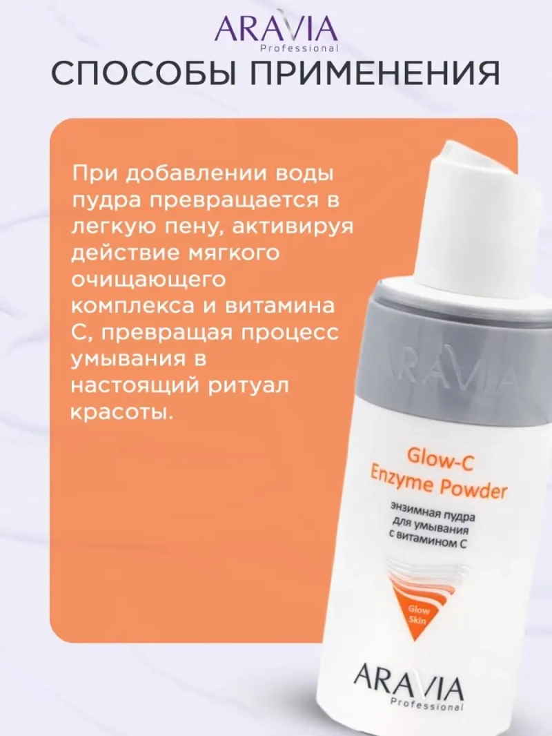ЭНЗИМНАЯ ПУДРА ДЛЯ УМЫВАНИЯ С ВИТАМИНОМ С GLOW-C ENZYME POWDER, 150 МЛ. Энзимная пудра для умывания с папаином и витамином С не только глубоко очищает кожу лица, но и выравнивает тон кожи, уменьшает пигментацию, придавая коже естественное сияние. При добавлении воды пудра превращается в легкую пену, активируя действие мягкого очищающего комплекса и витамина С, превращая процесс умывания в настоящий ритуал красоты. Назначение: поверхностное очищение кожи, подготовка к интенсивному уходу. Рекомендации для использования: Профессиональный уход: первый этап косметологической процедуры — очищение кожи. Домашний уход: в качестве ежедневного ухода для жирной кожи, 1-3 р/нед для всех типов кожи. Биоактивный состав: папаин, витамин С. Витамин С — мощный антиоксидант, способствует образованию коллагеновых волокон, уменьшая морщины, замедляет процессы фотостарения, благотворно воздействует на микрорельеф и цвет кожи. Состав продукта (INCI): Disodium Lauryl Sulfosuccinate, Papain, Microcrystalline Cellulose, Starch, Maltodextrin, Hydroxypropyl Methylcellulose, Sodium Ascorbyl Phosphate, Parfume. СПОСОБ ПРИМЕНЕНИЯ: Небольшое количество пудры насыпать в смоченную водой ладонь. Вспенить средство и массажными движениями нанести на влажную кожу лица и шеи, избегая области вокруг глаз. Смыть водой. Меры предосторожности: не наносите на поврежденную кожу и избегайте попадания в глаза. При попадании в глаза тщательно промойте водой. Перед применением тестируйте на небольшом участке кожи.