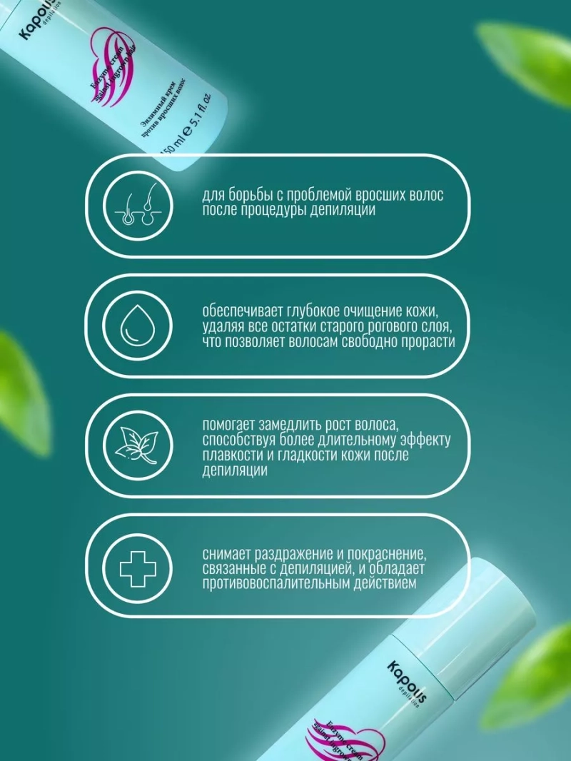 Энзимный крем против вросших волос Kapous - это инновационный продукт, специально разработанный для борьбы с проблемой вросших волос после процедуры депиляции. Возможно, каждая из нас сталкивалась с этой неприятной проблемой, которая может вызывать раздражение и неудобство. Однако, благодаря уникальной формуле этого крема, вы сможете решить эту проблему эффективно и безболезненно.Этот энзимный крем содержит папайю и АНА кислоты, которые действуют в синергии, чтобы устранить ороговевшие клетки эпидермиса и предотвратить появление вросших волос. Энзимы папайи, известные своими отшелушивающими свойствами, обеспечивают глубокое очищение кожи, удаляя все остатки старого рогового слоя, что позволяет волосам свободно прорасти. АНА кислоты, такие как лимонная, гликолевая, яблочная и салициловая кислоты, помогают замедлить рост волоса, способствуя более длительному эффекту плавкости и гладкости кожи после депиляции.Дополнительно обогащенный экстрактами арники и корня солодки, этот крем снимает раздражение и покраснение, связанные с депиляцией, и обладает противовоспалительным действием. Они успокаивают кожу и снижают воспалительные процессы, делая процедуру депиляции более комфортной и безопасной.В составе крема также присутствует салициловая кислота, которая регулирует работу сальных желез и снижает жирность кожи. Таким образом, крем не только предотвращает появление вросших волос, но и помогает балансировать жирность кожи, делая ее более здоровой и сияющей. Неотъемлемой частью формулы этого крема является экстракт граната, который обладает мощным антиоксидантным действием. Он защищает кожу от свободных радикалов, предотвращает преждевременное старение и помогает сохранить молодость и свежесть вашей коже на долгое время.Миндальное масло - еще один ценный ингредиент в составе этого крема.