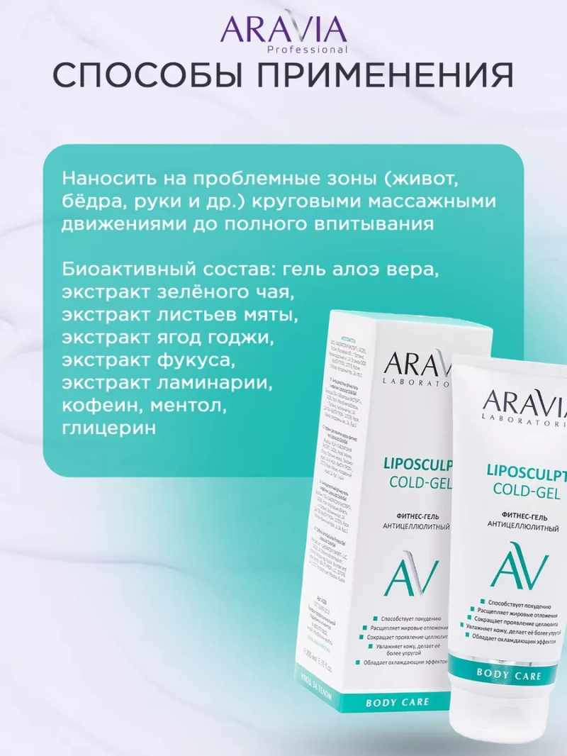 Фитнес-гель борется с несовершенствами кожи тела. Уменьшает проявления целлюлита и замедляет рост жировых клеток. Полезен после тренировки: приятно охлаждает и восстанавливает мышцы. Кожа становится упругой и эластичной, а лишние сантиметры уходят. - Водоросли фукус и ламинария выводят лишнюю жидкость из проблемных зон. - Кофеин усиливает циркуляцию крови и нормализует обменные процессы. - Экстракты ягод годжи и зеленого чая выводят токсины и способствуют выработке коллагена.